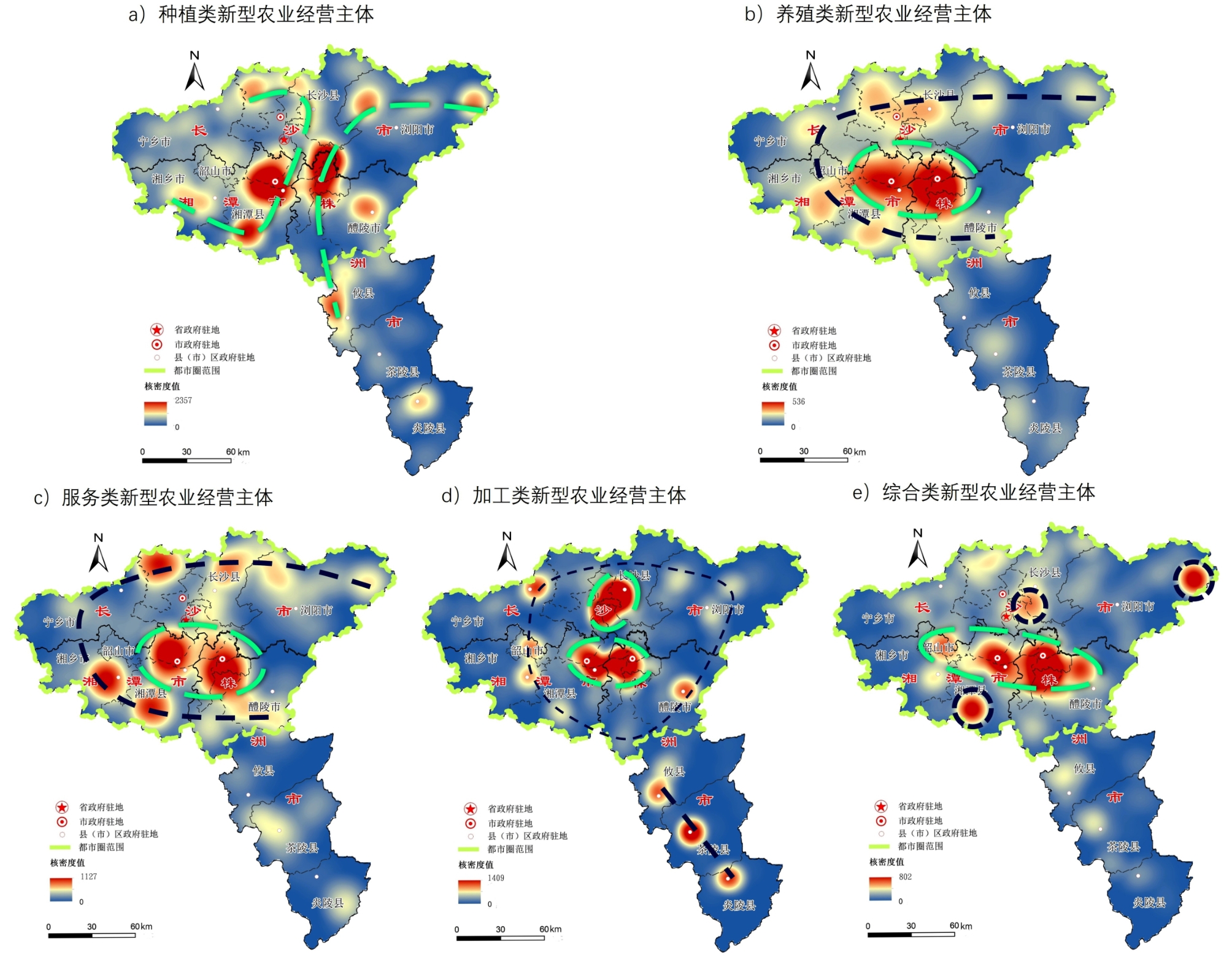 文章以长株潭城市群新型农业经营主体为研究对象,运用核密度、地理探测器、时空地理加权回归等方法,以2017、2020、2023年为时间节点分析了长株潭城市群新主体时空格局演变并解析其影响因素,最后探讨其空间优化对策。结果显示,1)长株潭城市群新主体总量呈上升趋势,增速先增后降,具有阶段性特征;类型结构由龙头企业为主转变为以家庭农场为主,产业类型结构由加工类为主转变为以种植类与加工类为主。2)长株潭城市群新主体呈显著集聚且时序上集聚度呈提升趋势,空间上城市群北部集聚度显著高于南部。集聚格局经历了由“两主多副”向“三主三副”再向“两主三副”的演变。主、副核心均分布于北部都市圈核心区及边缘区,集聚空间与城市群圈层结构存在一定的相关性。3)基于产业类型划分的5大类新主体空间格局各异,但均呈显著集聚且主核心相似。4)农业特色与创新、农业现代化水平是城市群新主体空间分布的核心影响因素,各因素的驱动作用存在显著的时空异质性。加工类新主体与其他类型新主体空间格局的主要影响因素存在一定差异。5)基于整体性思维与差异化施策,针对长株潭城市群整体以及城市群新主体核心区、新主体核心边缘区及南部远郊县区各圈层提出了促进新型农业经营主体发展的对策建议。
