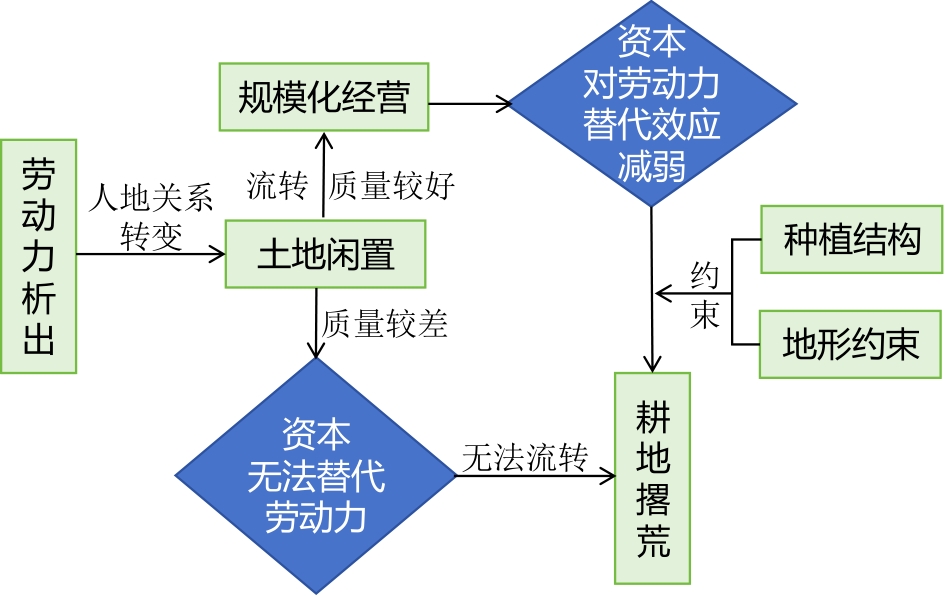 耕地作为农业生产的核心要素,是粮食安全、生态环境保护和农业可持续发展的重要基础。为探究耕地撂荒的影响机制,有效治理耕地撂荒问题,文章基于Cobb-Douglas生产函数,测算农业资本对劳动力的边际替代率,通过双固定效应模型,分析要素替代对耕地撂荒的作用效应及其区域约束性。结果发现:1)农业资本对劳动力的边际替代效应逐年增强,能在一定程度上缓解劳动力投入减少对耕地撂荒的负面影响;2)在种植结构约束下,高经济作物区的要素替代调节效应显著强于低经济作物区;在地形约束下,平原地区的要素替代对耕地撂荒具有显著抑制作用,而丘陵地区效应不显著。3)资本对劳动力替代的调节作用存在双重门槛特征,在不同替代率区间呈非线性调节效应,说明要素替代对撂荒的影响具有阶段性和边界性。未来应通过政策引导加大农业资本投入,优化种植结构,推进农业机械化进程,提升不同区域农业要素替代能力,从而有效遏制耕地撂荒现象。