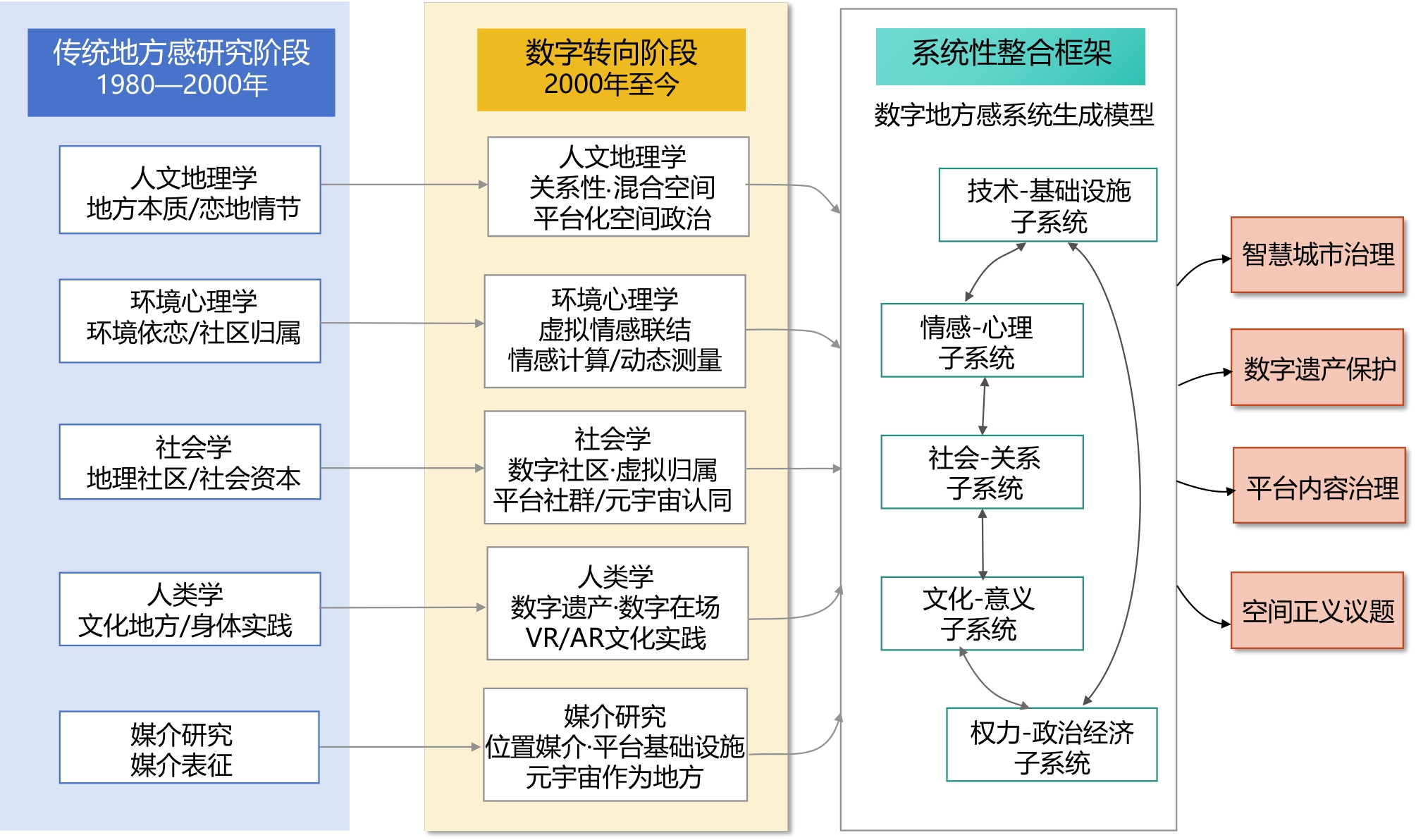 随着数字媒介技术在当代社会中的深度嵌入,地方不再仅作为物理空间被感知和经验,而是在平台架构、算法逻辑与媒介实践的持续作用下,被不断生产与重塑。围绕这一转变,学界已从人文地理学、环境心理学、社会学、人类学与媒介研究等多个学科对数字情境中的地方感展开探讨,但相关研究长期呈现概念分散、视角区隔与理论碎片化的特征,尚缺乏能够解释“数字-地方”复杂耦合机制的整合性框架。文章基于1980—2025年国内外相关文献的系统梳理与知识谱系分析,追溯了数字地方感在多学科交汇中的涌现路径,揭示其从静态属性向过程性、从物理依附向媒介构成的理论转向。在此基础上,提出将“数字地方感”理解为一种系统性生成式整合概念框架,将技术基础设施、情感心理机制、社会关系网络、文化意义生产与权力-政治经济结构纳入同一分析视野,强调数字地方感是一种在多重子系统互动中持续生成的动态过程。文章认为,引入系统性生成视角有助于推动数字地方感研究从多学科并行走向理论整合,为理解平台社会中的空间经验、情感政治与地方治理提供新的分析路径。