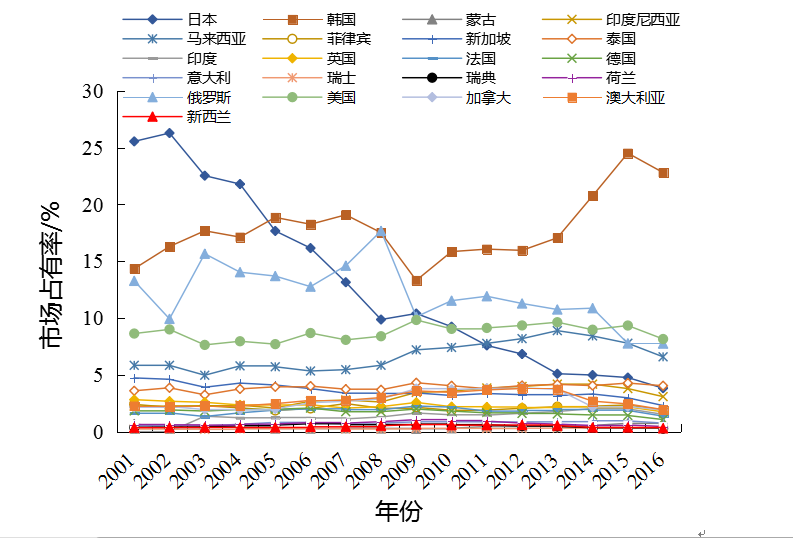 | 韩国 | 15.13(1) | 22.81(1) | 0.096 2 | 0.110 6 | 明星市场 | 明星市场 | ||