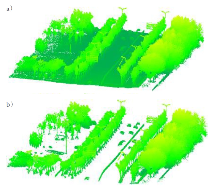 文章提出一种完整的全自动化处理框架,基于三维激光点云数据对高速公路和城市道路场景的杆状目标进行了检测和分类,主要包括3个步骤:数据预处理、杆状目标检测和分类。其中,在数据预处理阶段,采用基于布料模拟滤波算法自动分离地面点和非地面点,然后基于欧氏距离聚类方法对非地面点进行快速聚类,以及采用迭代图割算法进一步分割目标对象;在目标检测阶段,集成先验信息、形状信息和位置导向搭建滤波器,对杆状目标进行检测;在对象分类过程中基于多属性特征,利用随机森林分类器对目标的特征进行计算和分类。并使用3个道路场景数据集进行测试,结果显示,3个数据集的整体MCC系数为95.6%,分类准确率为96.1%。这说明文章所构建方法具有较高性能。另外,该方法还可以鲁棒地检测杆状目标的重叠区域,较为适应复杂程度不同的道路场景。