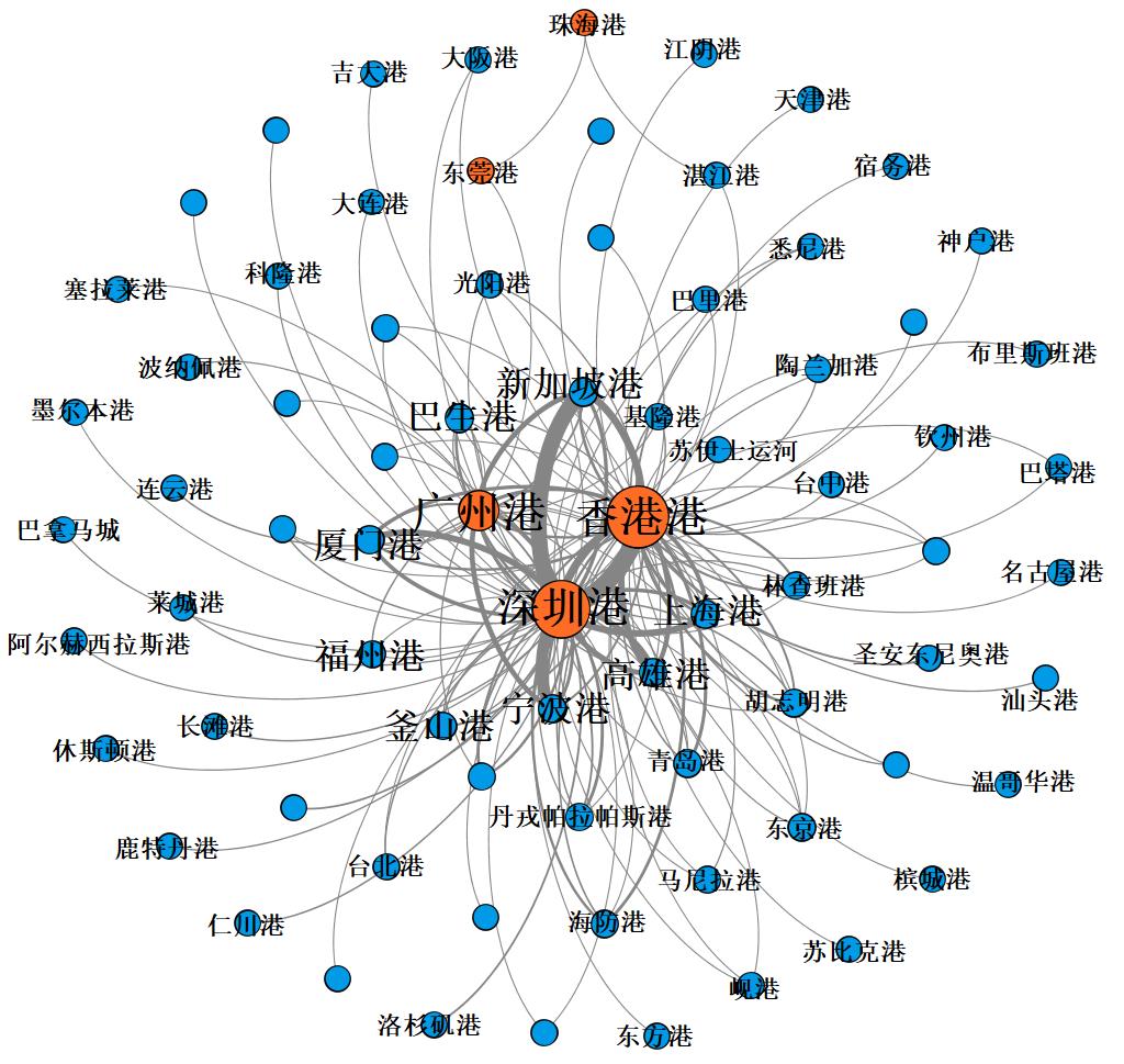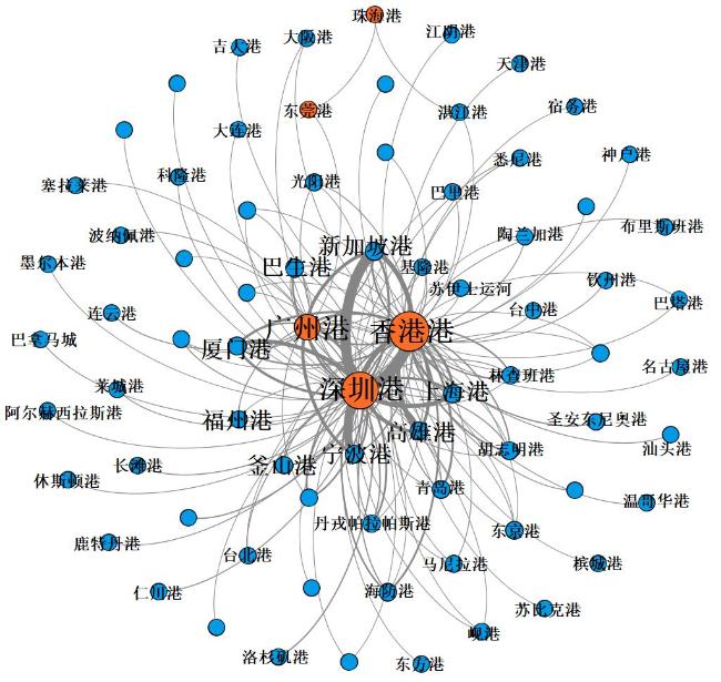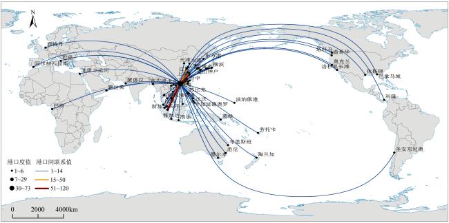 图3 粤港澳大湾区与全球港口航运联系拓扑Fig.3 Topological diagram of the shipping network between the Guangdong-Hong Kong-Macao Greater Bay Area and the global port |
