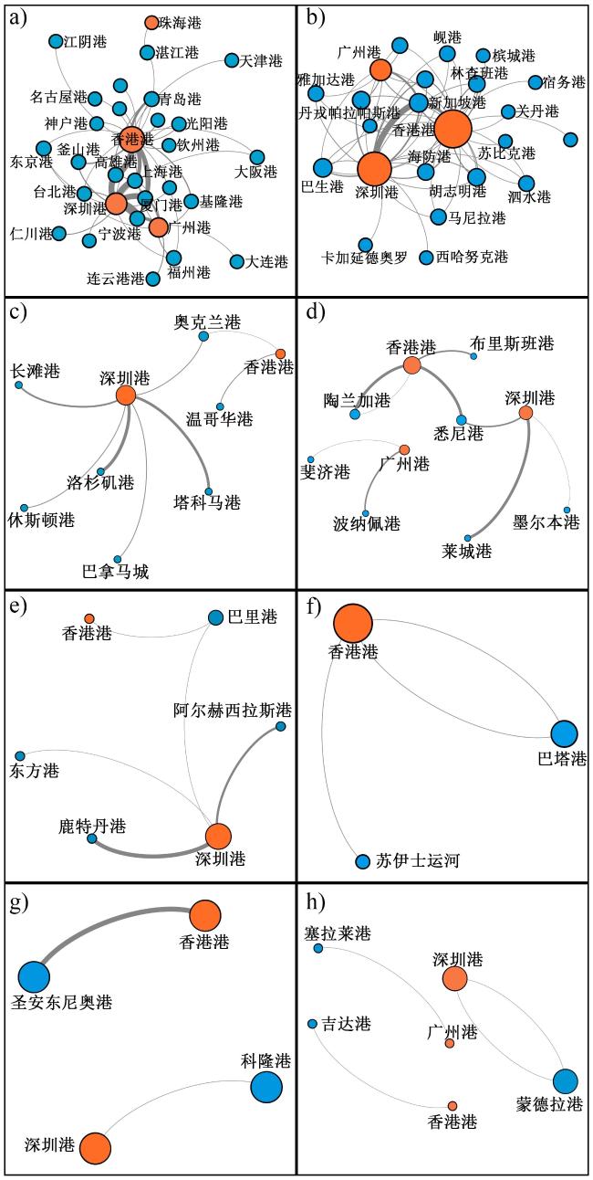 图5 大湾区与全球航运网络联系拓扑关系(a. 东亚;b. 东南亚;c. 北美洲;d. 大洋洲;e. 欧洲;f. 非洲;g. 拉丁美洲;h. 中东中南亚)Fig.5 The topological relationship of the shipping network between the GBA and the eight major regions of the world(a. East Asia; b. Southeast Asia; c. North America; d. Oceania; e. Europe; f. Africa; g. Latin America; h. Middle East, Central Asia and South Asia) |