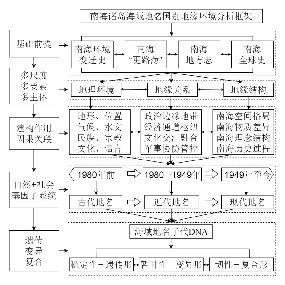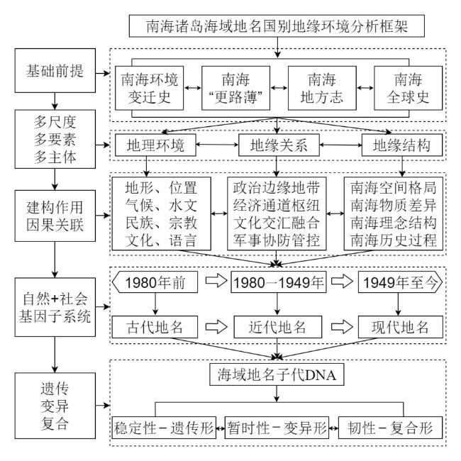 Since the Anthropocene epoch, the geopolitical environment in the South China Sea has become complex due to the involvement of neighboring and extraterritorial powers, and China's maritime rights and interests are constantly being restricted, squeezed and challenged. Starting from the geographical environment, geographical relationship and geographical structure of the natural and social gene subsystems, this paper divides three types of ancient-hereditary toponymic DNA, modern-variant toponymy DNA and modern-complex toponymy DNA from the logical starting point of placenames. A country-specific geo-environmental analysis framework for geographical names in the Nanhai Zhudao. The results showed that: 1) the names of the Nanhai Zhudao (South China Sea islands) were determined through the interaction of natural genetic and social genetic subsystems. 2) Considering cause-effect correlation, the source flow of the names of the Nanhai Zhudao from "owner-other-owner" led to the changes in genetics, mutation, and compounding in the transcription and expression of toponymic genes. For construction, the neighboring or extraterritorial powers used illegal means to build new geopolitical relationships for multilateral competition for maritime resources and maritime rights in the South China Sea. 3) The origin of the names of the Nanhai Zhudao was determined to be an interactive coupling process of spatial and material dominant genes and conceptual and historical evolutionary recessive genes in terms of gene transcription and expression..