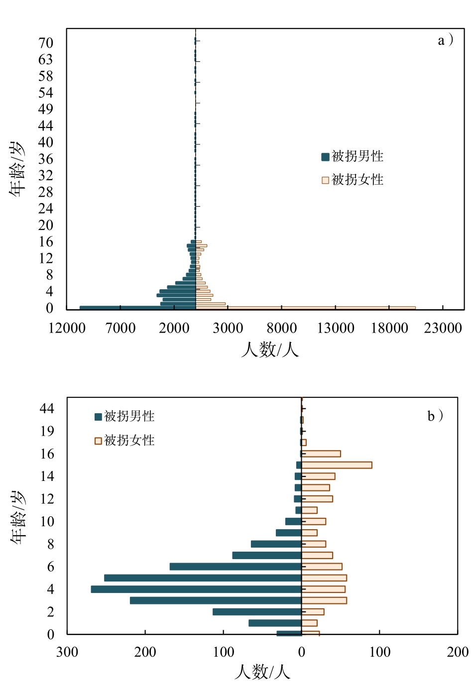 图3 1900—2022年中国被拐人口省域分布 [a. 拐出(总数25 373人);b. 拐入(总数42 147人)] Fig.3 Provincial distribution of trafficked human in China from 1900 to 2022 (a. trafficked human, 25,373; b. human being bought, 42,147) |