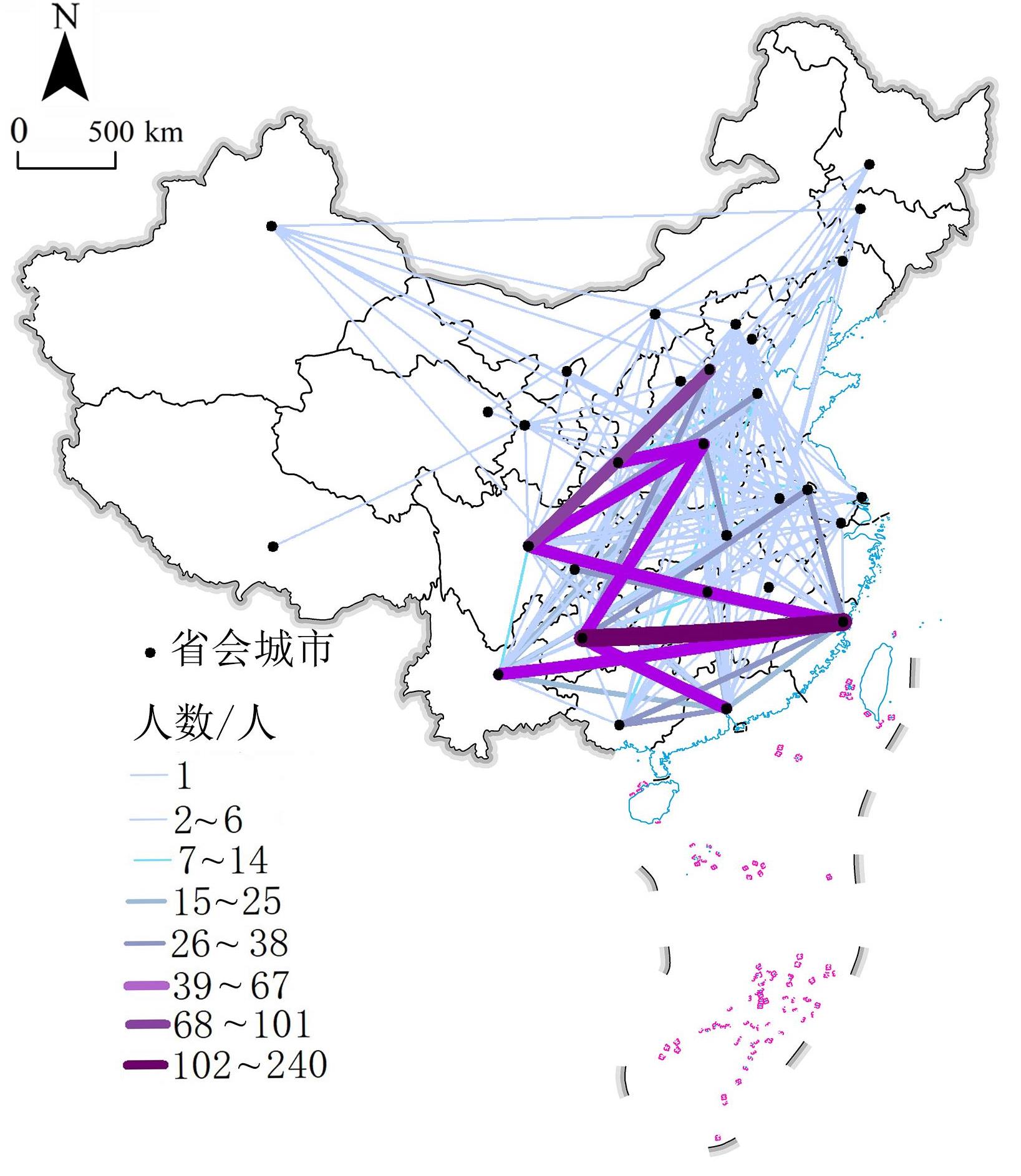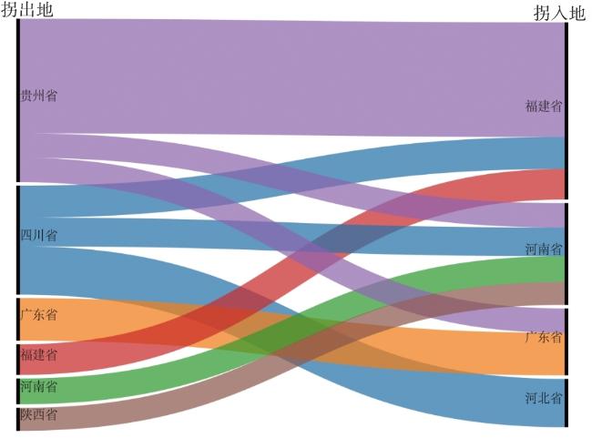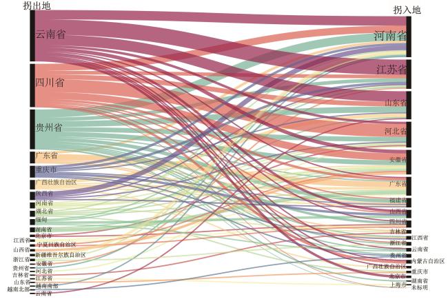 图5 1930—2021年中国被拐人口省际贩运路径(总数2 231人)Fig.5 Inter-provincial routes of human trafficking in China from 1930 to 2021(trafficked human, 2,231) |