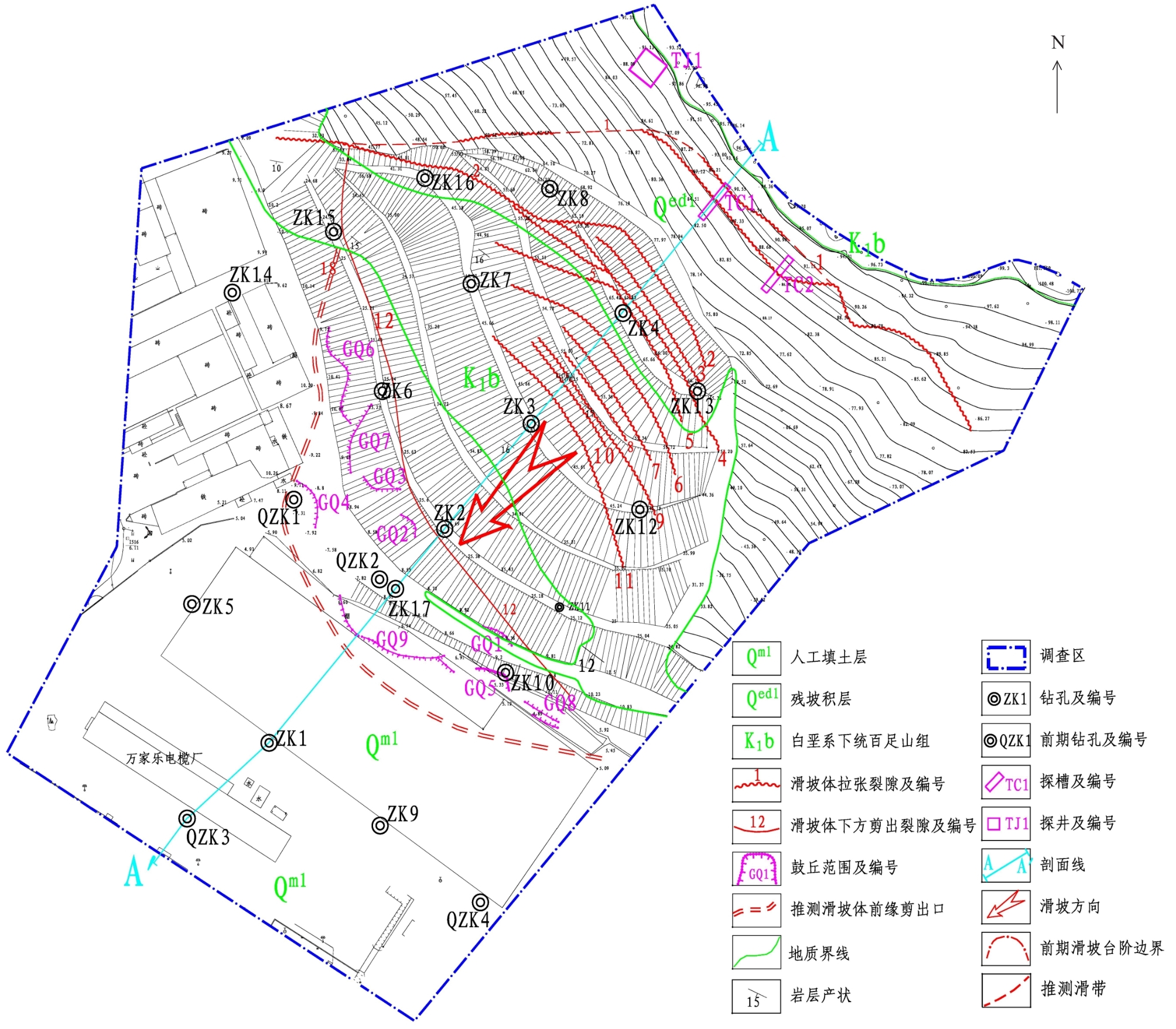 采用工程地质钻探、物探、地质测绘及室内试验等技术方法探讨飞鹅山Ⅲ号滑坡形成机理与防治技术。结果表明:1)滑坡体主要岩性为泥质粉砂岩,飞鹅山滑坡属于新形成的深层中型牵引式滑坡,在平面上呈圈椅状。2)滑坡属于双层滑面滑坡,主滑面以中型深层滑坡为主,主滑体上部发育中型中厚层滑坡。3)滑坡产生的原因为:①泥质粉砂岩倾向与坡向基本一致,且岩层倾角为中等倾角;②人工开挖使坡脚形成高陡临空面,抗滑力大为降低;③雨水沿层面及节理裂隙入渗至坡体深部,大大增加岩土体容重,同时泥质粉砂岩遇水软化,抗剪强度显著降低。4)结合该滑坡区地质环境条件,采用坡面削坡+锚杆(索)+格构梁+双排预应力锚拉抗滑桩+三维网植草绿化+截排水+毛石挡墙的综合治理方法进行防治,监测结果显示该滑坡变形及位移已得到有效控制,整治效果良好。