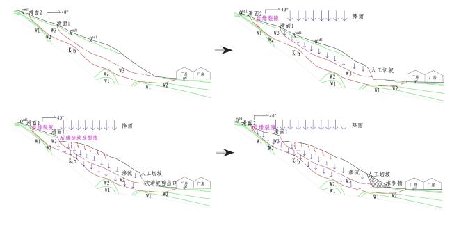 Landslide No.3 in Fei'e Mountain is located in the Shunde District of Foshan City, Guangdong Province, and its' lithology is mainly composed of pre-Cretaceous Baizushan Formation (K1b) argillaceous siltstone. In this study, engineering geological drilling, geophysical exploration, geological mapping, and indoor testing were used to determine that it is a medium-scale bedding rocky landslide with a typical double-layer deep sliding surface. The maximum length of the landslide body is approximately 220 m in the longitudinal (south-west) direction and approximately 230 m in the horizontal (north-west) direction; the maximum thickness is approximately 32m, and the attitude of sliding surface is 230°∠12°-17°. Landslide body tensile cracks, including nine large-scale tensile cracks, are very well-developed. The longest crack is approximately 120 m long and has a crack opening width of 0-13 cm, with a height difference between the two sides of the crack (rupture wall) of 0-0.2 m. The ground of the leading edge of the landslide was uplifted and cracked, with a maximum uplift height of approximately 1.7 m. The landslide shear outlet was clearly visible and exhibited well-developed scratches. The scratch direction was the same as the main slide direction of the underlying landslide. Landslide deformation severely cracked the building structure and obstructed the drainage channel. There was a loose residual soil layer on the surface of the slope of Landslide No.3, and many fractures and joints were present in the lower bedrock. During rainfall, rainwater penetrated the deep part of the slope along the rock layer surface, joints, and fractures, which greatly increased the bulk density of the rock and soil mass, and softened the argillaceous siltstones, which greatly decreased their shear strength. The excavation of the slope formed a steep surface, which reduced the load at the foot of the slope and thus reduced the anti-sliding force. During long-term seepage, the rock and soil mass near the landslide face was softened to form a weak zone mixed with joints and stratigraphic phases. During long periods of heavy rain, the weak zone became soaked, soft, and plastic, which reduced its shear strength. When downward force increased, the effective anti-sliding force of the weak zone was greatly reduced, resulting in a landslide. During this process, Landslide No.3 developed two slip surfaces. The maximum buried depths of slip surfaces 1 and 2 (corresponding to landslides 1 and 2) were 32 and 15.5 m, respectively, which means that landslide 2 overlaid landslide 1 and slip surface 1 creeping occurred before that of slip surface 2. The trailing edge of slip surface 1 developed a fissure, the characteristics of which are described above. As the fracture surface was not fresh, its' development time is unknown. As in the sliding process, landslide 2 first formed a continuous sliding surface, and its' sliding rate was slightly greater than that of landslide 1, landslide 2 was the first to cut out from the steep ridge of the landslide's front edge. As a result of the shearing action of landslide 2, landslide 1 developed multiple vertical cracks. Rainwater seeping down these cracks further lubricated slip surface 1, which resulted in drum mounds and cracks in the leading edge of the landslide. Slip surface 1 subsequently formed a continuous sliding surface, and Landslide No.3 entered the uniform deformation stage. Timely emergency measures prevented landslide deformation damage and halted landslide progression before entering the accelerated deformation stage. Considering its double-layer slip surface structure, a comprehensive combination of slope cutting, an anchor (cable), lattice beam, double-row prestressed anchor-pulling anti-slip pile, three-dimensional mesh grass greening, interception, drainage, and a hairy stone retaining wall was used to prevent and control the landslide. Long-term monitoring results showed that these methods had a high rectification effect and successfully controlled landslide deformation and displacement.