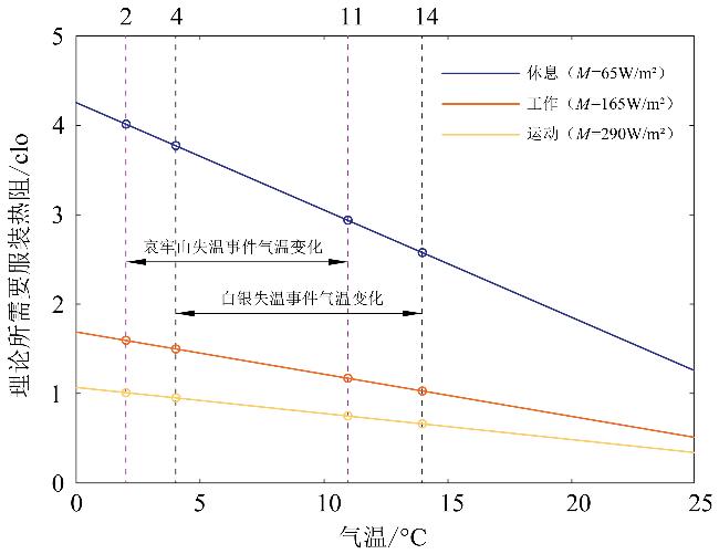 表3 哀牢山地质人员在不同的活动水平、不同的气温下所需要的服装热阻Table 3 Clothing thermal resistance required by geological personnel in Ailao Mountain under different activity levels and different temperatures |