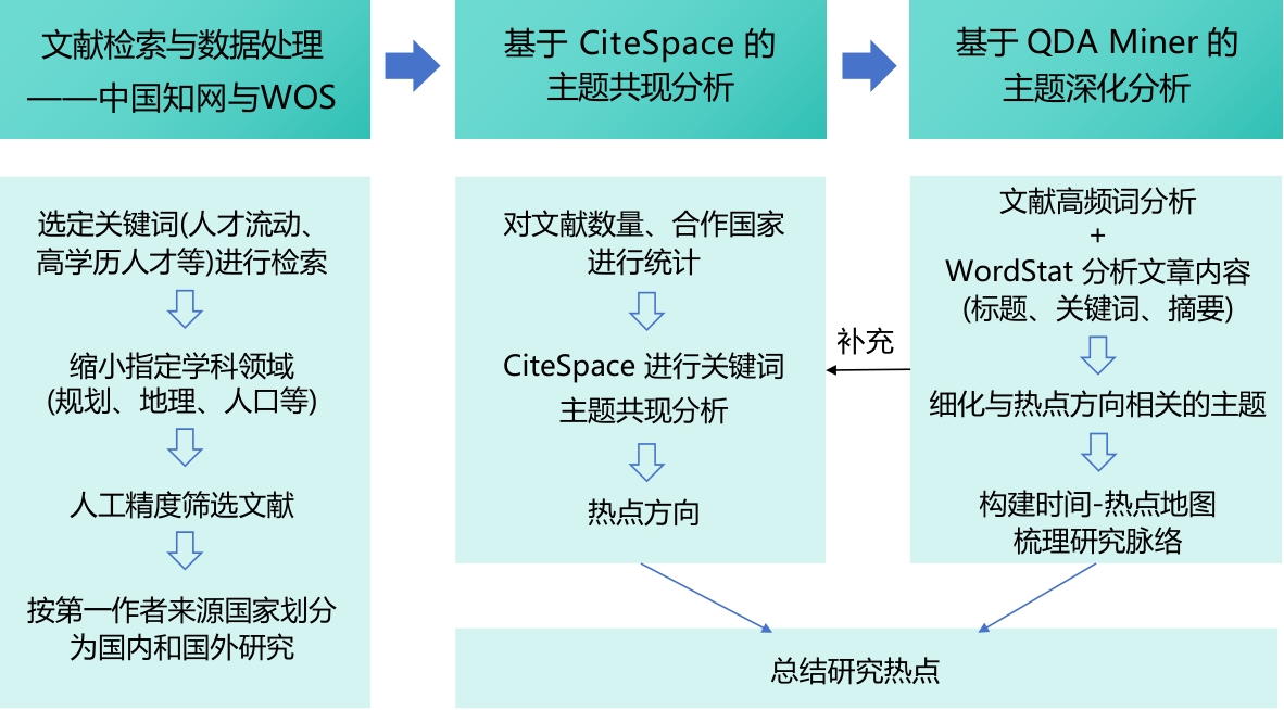 Skilled migration is a pivotal phenomenon underpinning globalization that has attracted widespread scholarly interest; a nuanced understanding of the patterns and mechanisms of skilled migration is considered essential for fostering coordinated regional development and enhancing labor market allocation. To compare the domestic and international talent mobility research in the 21st century and advance China's talent mobility theory, In this paper, we reviewed Chinese and English literature from fields such as geography, urban planning, demography, economics, and management since 2000 via quantitative and qualitative analysis. Initially, we conducted bibliometric and keyword co-occurrence analyses using CiteSpace to identify research hotspots and trends; subsequently, we performed Qualitative Data Analysis Miner qualitative analysis as a supplementary approach to derive in-depth insights and determine connections between literature sources. Herein, we summarize the research hotspots regarding skilled migration, domestically and internationally. We found that concerning research hotpots, domestic research emphasizes the spatial distribution of different types of talent, the impact of urban factors on skilled migration, and the interplay between talent and urban innovation. In contrast, international research emphasizes more on the mobility decisions of highly skilled migrants within a globalization context, focusing on the impact of international high-skilled migration on the destination and origin countries, the micro-level mechanisms of migration decision-making (such as family dynamics, gender roles, and early career stages), and social adaptation in destination countries (including identity, sense of belonging, and related factors). Theoretically, both domestic and international studies are based on labor migration theory, examining skilled migration mechanisms from macro-regional and micro-individual perspectives, and expanding theoretical frameworks to include amenities and the creative class. However, owing to differences in social, economic, institutional, and developmental contexts among countries, these theories are not entirely applicable in practice, particularly regarding their explanatory power in the Chinese context, which requires further examination. Furthermore, in terms of research progress, we found that international studies are increasingly highlighting the life course of migrants and the socio-cultural micro-mechanisms influencing skilled migration, emphasizing the adoption of a combination of quantitative and qualitative analytical methods. Conversely, domestic research predominantly focuses on the spatial patterns of skilled migration and the effects of macro-urban factors, relying on quantitative analyses. Future research in China should aim to examine micro-mechanisms, develop indigenous theoretical frameworks to foster theoretical innovation, and enhance the integration of qualitative and quantitative methods. Moreover, exploiting the potential of big data and emerging technologies could contribute towards overcoming limitations associated with data acquisition. On the basis of our survey of current theories and methods, we propose the following four directions for future research: (1) strengthening investigations into the micro-mechanisms of skilled migration; (2) developing indigenous theoretical frameworks to support theoretical innovation in China; (3) promoting the integration of qualitative and quantitative research methods; and (4) enhancing data acquisition and exploiting big data and advanced technologies to overcome the current limitations associated with acquiring data.