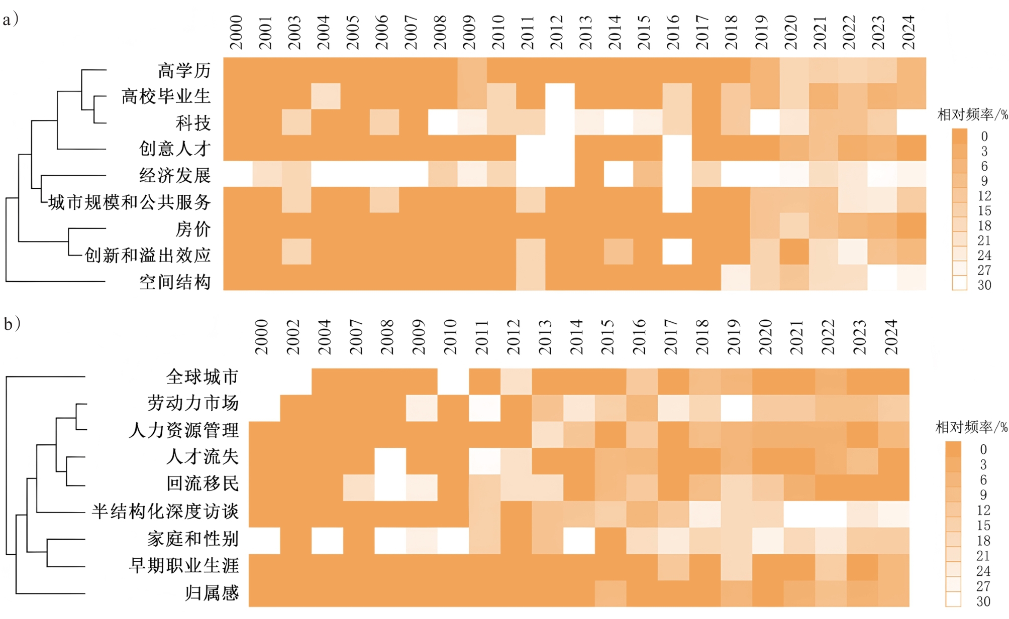 文章利用定量与定性分析相结合的方法,对2000—2024年相关领域有关人才流动的中英文文献进行回顾,归纳国内外人才流动的研究热点,比较相关研究进展。结果表明:1)研究热点方面,国内侧重于不同类型人才的空间分布、城市因素对人才流动的影响及人才与城市创新的互动,而国外更聚焦于全球化背景下高技能移民的流动决策及其在流入国的社会适应;2)理论上,国内外均围绕劳动力迁移理论,从宏观区域与微观个人视角探讨人才迁移机制,并在此基础上拓展了舒适物、创意阶层等理论框架;3)研究进展上,国外逐渐凸显迁移者生命历程及社会文化微观机制对人才流动的影响,方法上趋向定量与质性相结合,而国内主要聚焦于人才流动空间格局及宏观城市因素的影响,以定量分析为主。未来中国人才流动研究应加强微观机制探讨,构建本土理论框架,推动质性与定量研究结合,并利用大数据和新技术突破数据获取的限制。