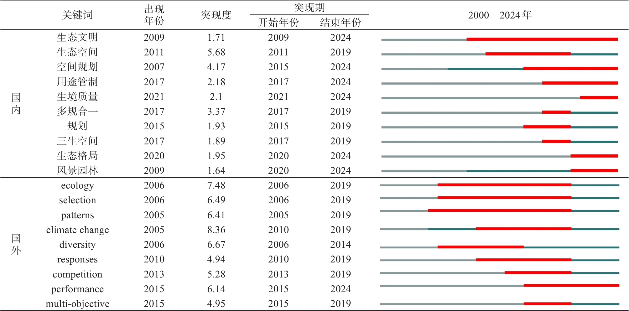 梳理生态空间识别与优化的研究进展,可深化生态空间研究的系统性认知,揭示生态空间研究如何从孤立保护走向系统治理,进而为国土空间综合治理和可持续发展提供参考。文章基于“三生”协同视角,运用文献计量方法,借助CiteSpace分析2000—2024年国内外相关研究热点,结合传统综述方法,梳理其研究进展,总结现有研究的不足,并展望未来发展方向。结果发现:1)研究期内,国内外发文量增幅相异但趋势相似,研究重心从单一的生态空间识别逐渐转向多功能生态空间的集成管理;2)生态空间内涵呈现从格局认知到功能统筹、人地协同的演变趋势,但关于协同机制缺少系统研究,未能有效缓解空间功能冲突;3)生态空间的研究方法持续优化,从要素、功能、过程和人地关系维度推动了生态空间研究体系的不断完善,然而多源数据异质性导致动态监测和多尺度分析存在一定均值误差;4)生态空间优化研究强调“三生”空间统筹,通过刚弹结合调控逻辑,守住生态安全底线的同时,推动生态功能向生产、生活价值转化,但在复杂人地系统的应用中,统筹生态过程与人类活动的动态建模仍需优化。未来应聚焦多源数据融合处理、人地系统互馈模拟及智能决策平台构建,强化生态空间保护修复与国土空间规划的深度衔接,为协同区域生态安全与高质量发展提供科学支撑。