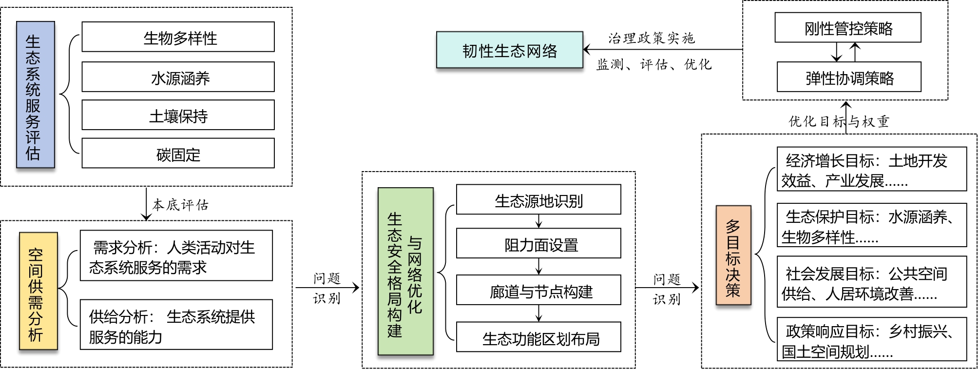 | 基于生态要素与 生态系统构成 | 遥感解析、GIS空间分析、 土地分类 | 划定生态保护区、 要素稳定区域 | 数据客观、成本低;但忽略动态过程, 无法充分反映生态服务功能 |