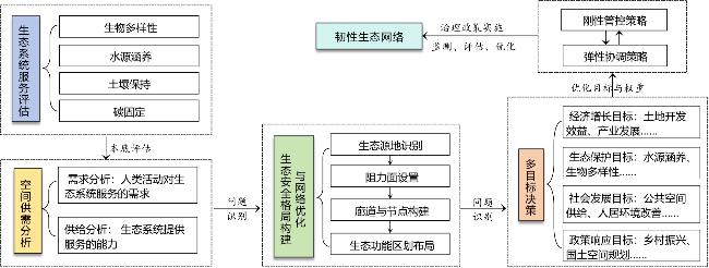 | 基于生态功能与服务 | 生态服务评价模型、 敏感性评价、指标体系 | 关键生态服务区识别、 服务价值评估 | 直观反映生态系统服务与功能,支持决策; 但数据需求高,主观性强 |