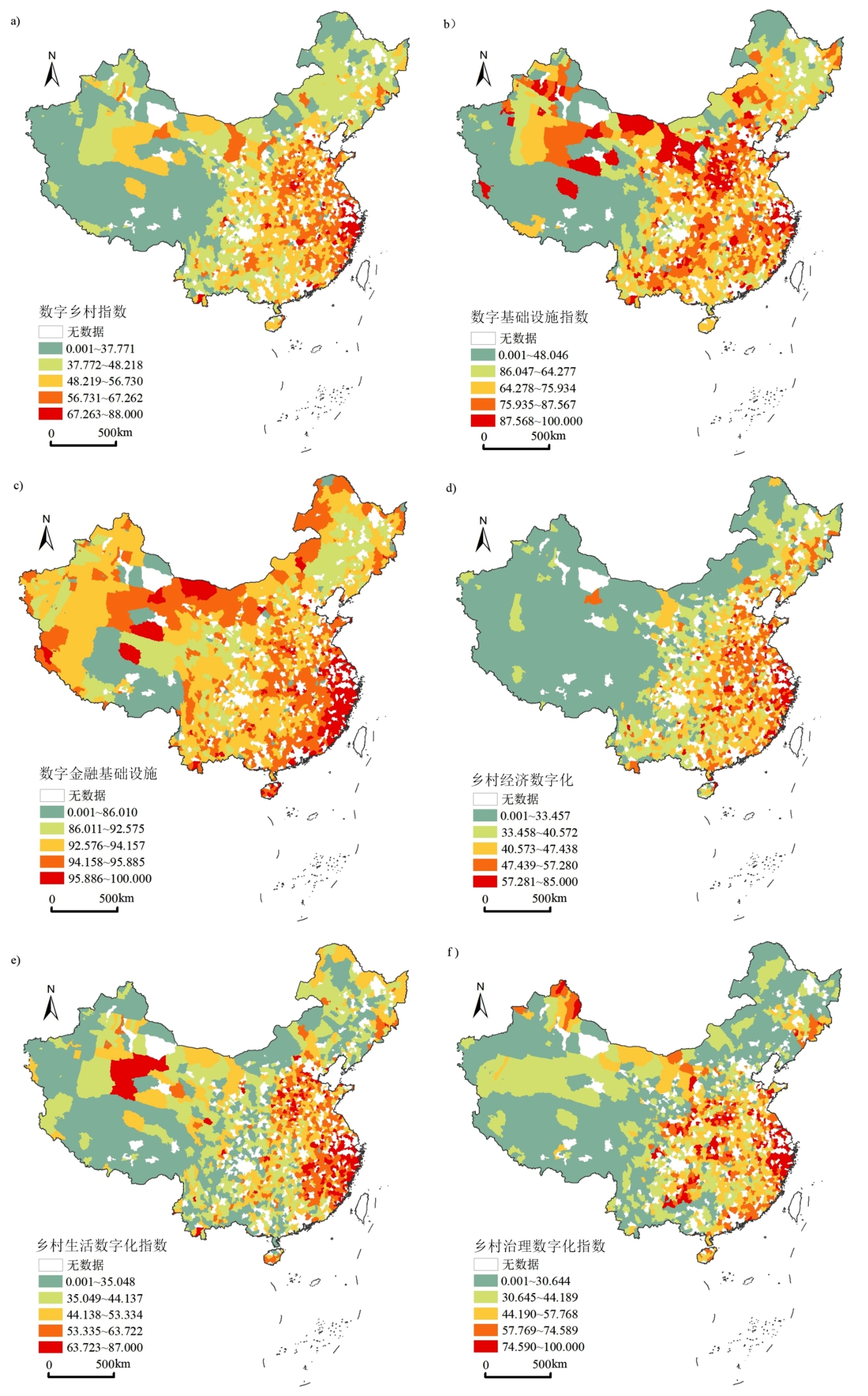 中国数字乡村指数与分项指标的空间格局