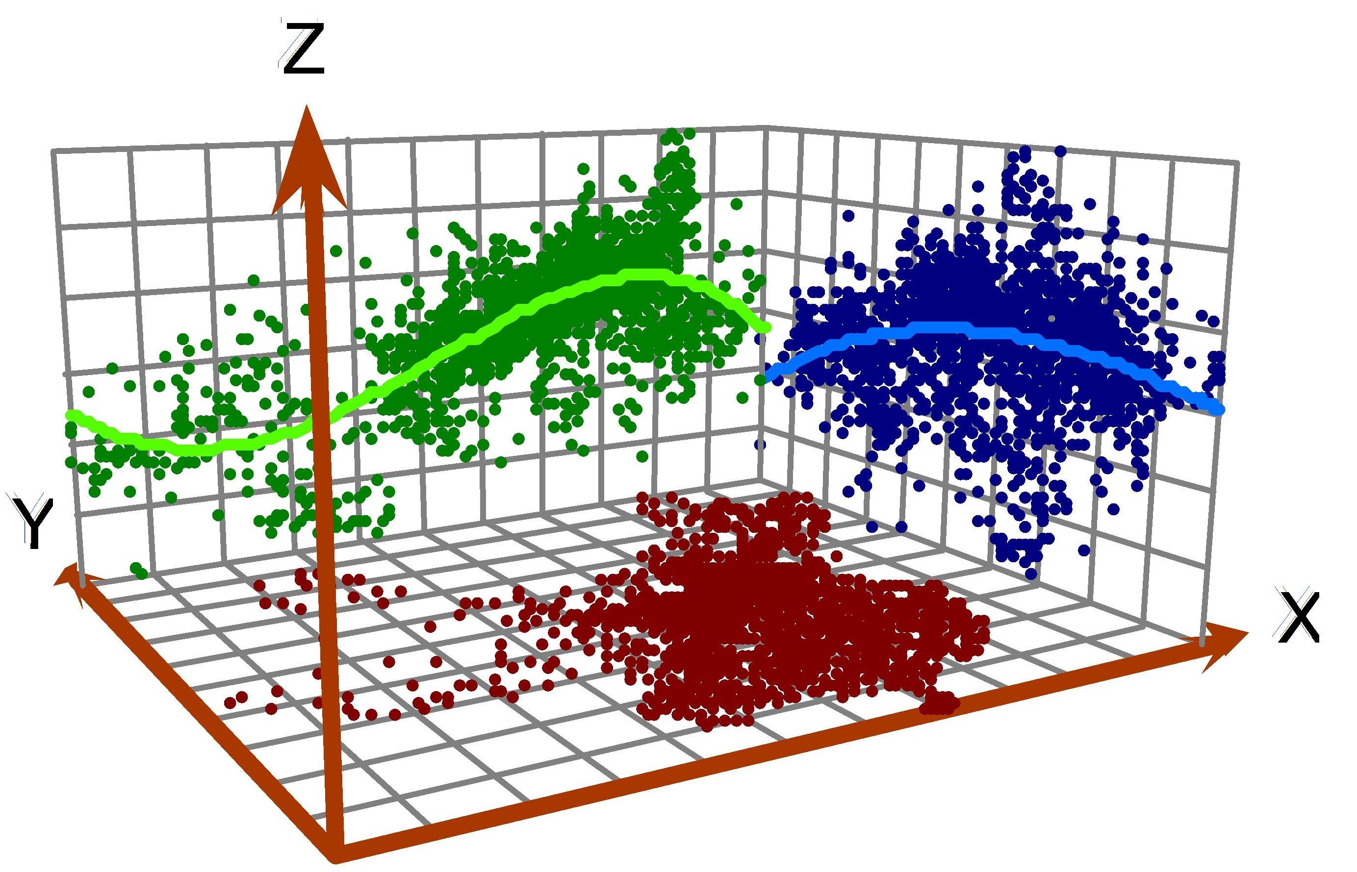 Z轴表示数字乡村发展程度,X轴表示东西方向,Y轴表示南北方向。散点是数字乡村发展在东—西和南—北向正交平面上的投影,将散点采用三次多项式拟合并旋转到合理的透视角度,得到一条最佳拟合线,模拟东—西和南—北方向上数字乡村发展的时空特征。