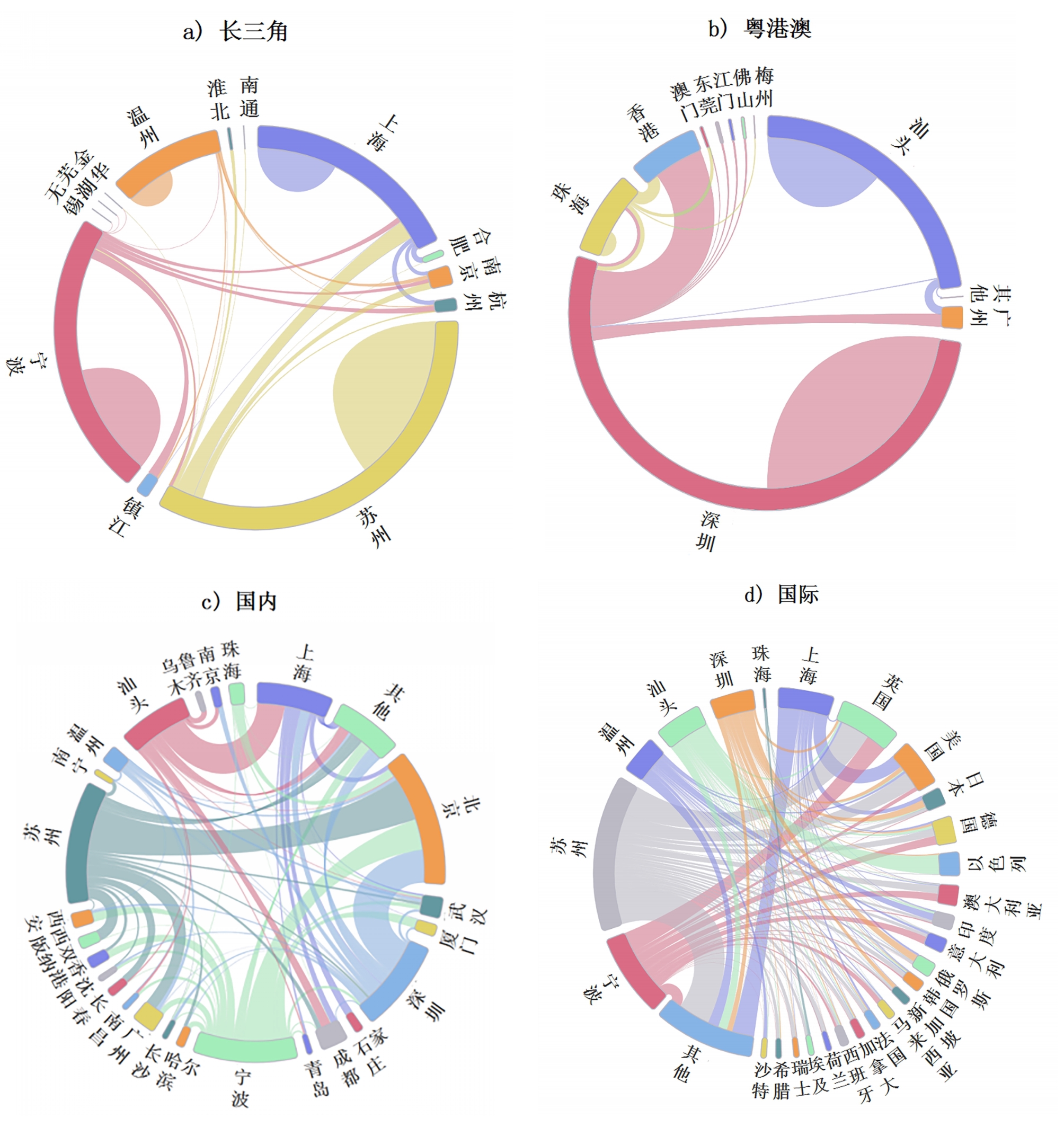 长三角(a)、大湾区(b)蜂鸣合作和国内(c)、国际(d)管道合作空间分布