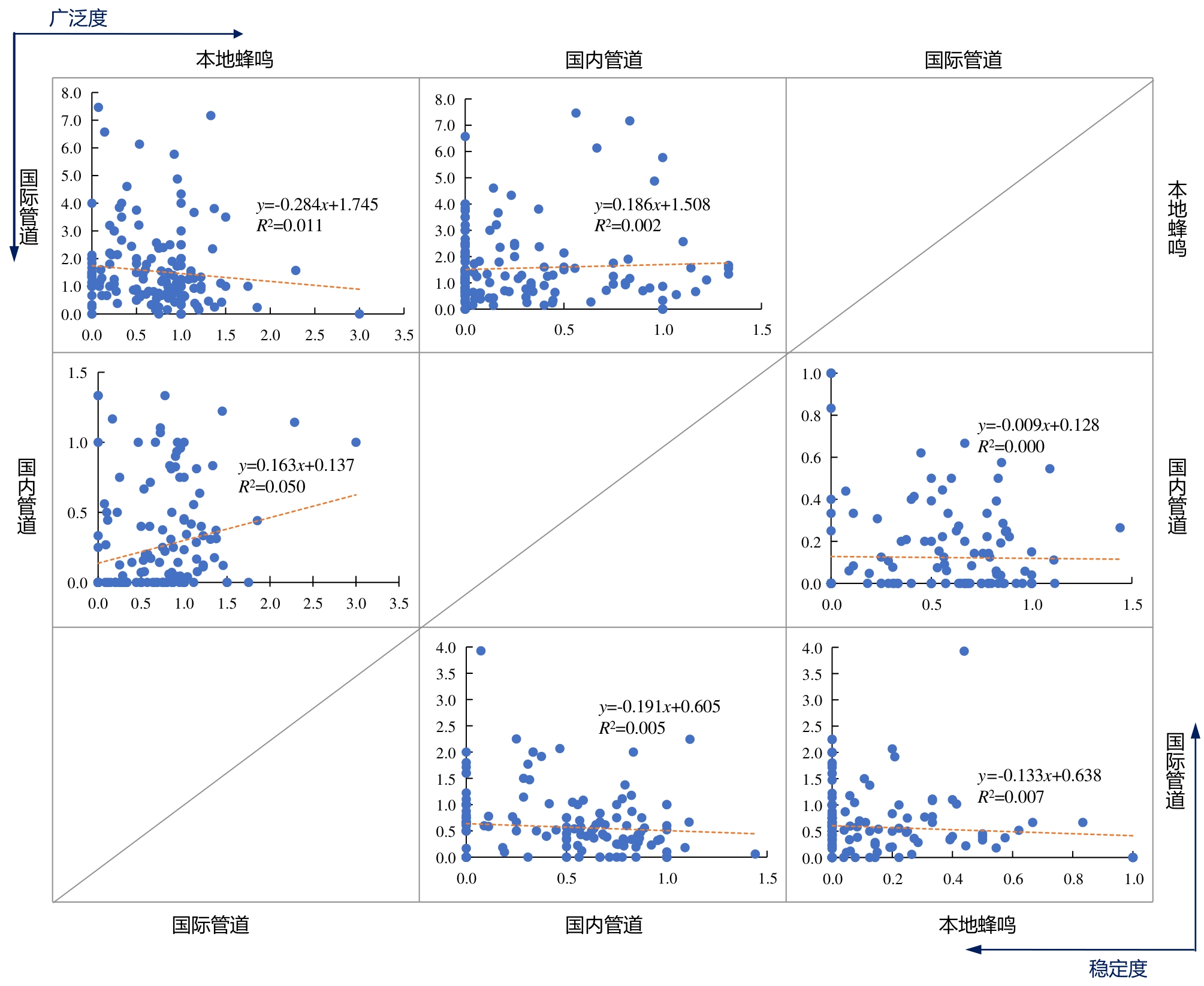 国际学者的本地蜂鸣、国内管道与国际管道的嵌入度相关性