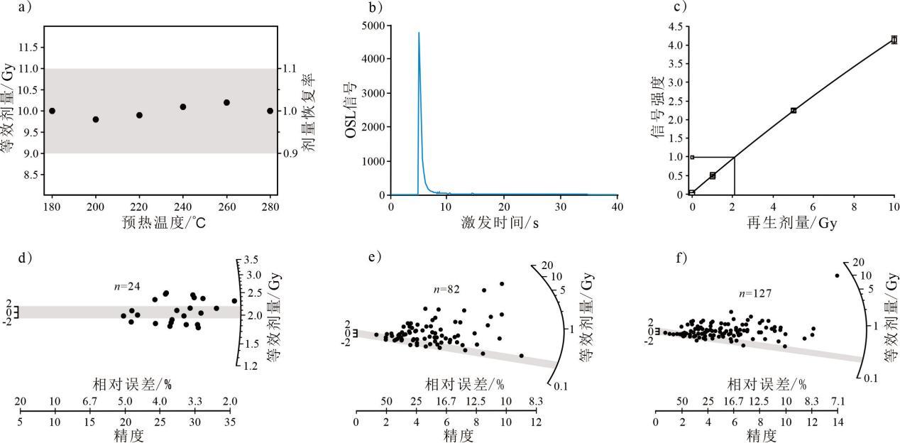 a、b、c和d分别为样品XB-2-1的预热实验与剂量恢复实验测试、释光信号衰减曲线、剂量响应曲线和单片等效剂量雷达分布;e和f分别为样品JY-1-1和JY-2-1的石英单颗粒等效剂量分布