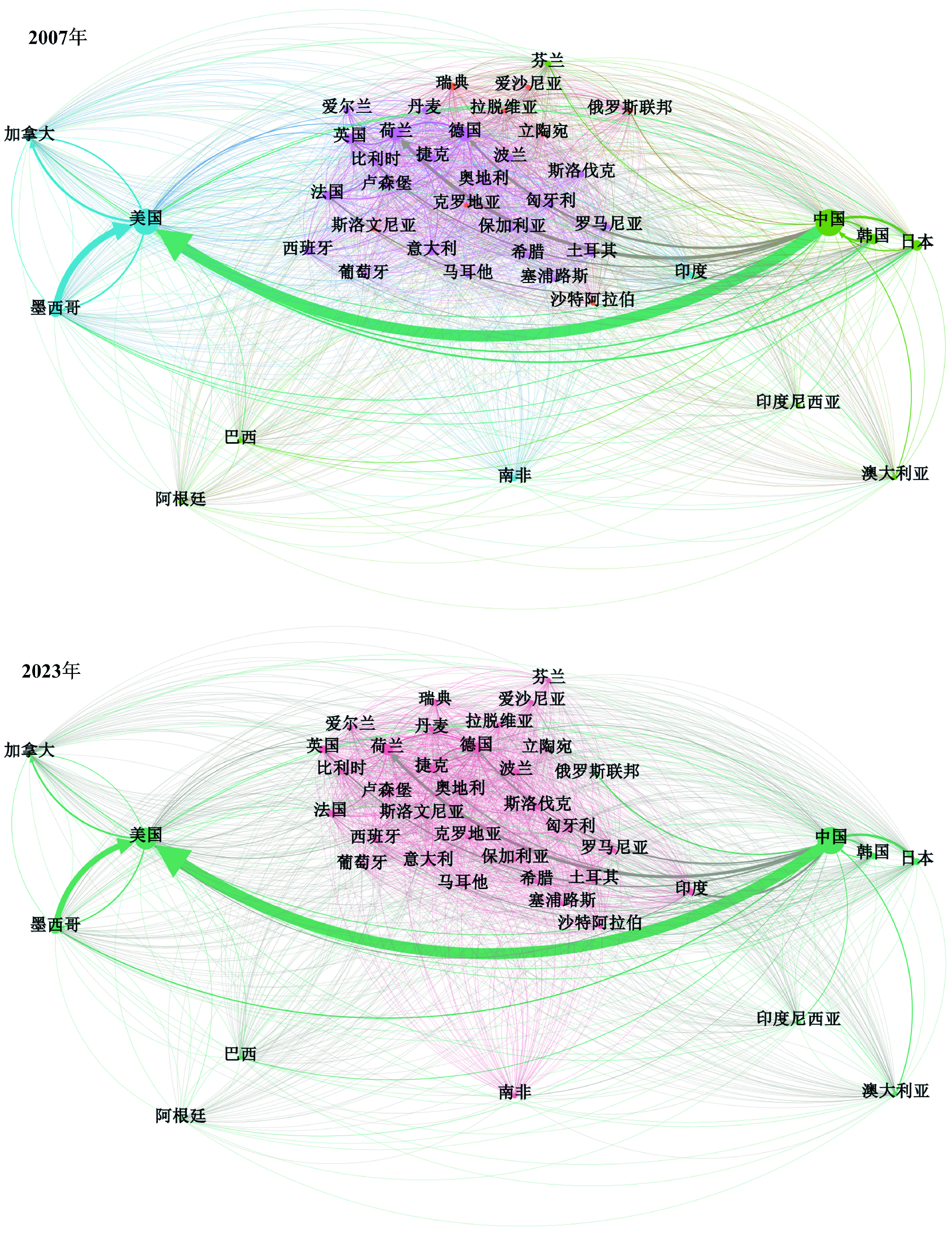 To reveal the evolutionary patterns and influencing factors of the trade dependency network in electronic and communication products among the G20 countries, this study selects trade data from five key years (2007, 2011, 2015, 2019, and 2023) sourced from UN Comtrade, covering critical phases including the pre-financial crisis period, the post-crisis restructuring, the rise of the digital economy, the pre-pandemic peak, and the post-pandemic geopolitical adjustment era. Based on these data, we construct a trade dependency network and adopt a multilevel analytical framework (overall network, community, and node) that combines complex network analysis and the Temporal Exponential Random Graph Model (TERGM) to systematically explore spatiotemporal evolutionary characteristics and driving mechanisms. The network as a whole exhibits distinct small-world characteristics of “high clustering, short average path length, and strong reciprocity,” with the “core-periphery” structure continuously solidifying and the degree of trade dependency among countries significantly deepening; even amid geopolitical conflicts and the COVID-19 pandemic, core dependency relationships remained stable, reflecting the inherent resilience of the global electronic and communication industry supply chain. The community structure has evolved from a “multi-polar dispersion” pattern to a “bipolar regionalization” pattern, with core nodes such as China, the United States, and Germany consistently dominating the network’s spatiotemporal layout: China has gradually upgraded to a dual hub integrating “technology export” and “intermediate product supply,” with its influence on regional cooperation continuously enhanced, while the United States maintains its core position in technological dependency, although its global radiation scope tends to shrink toward regional clusters. Germany steadily retains its role as a key hub in Europe, highlighting the synergistic efficiency of regional core cooperation. Network evolution is jointly driven by internal and external mechanisms: internally, the reciprocity effect promotes asymmetric two-way dependency, reflecting the complementary division of labor between core and peripheral countries in the global production network, and exacerbates core-periphery polarization, with dependency relationships mainly concentrated among key core nodes. The temporal dependency effect strengthens path dependency, rooted in long-term supply chain collaboration and technological lock-in. Externally, geopolitical dynamics drive the regionalization of dependency relationships by shaping countries’ risk perceptions and cooperation preferences. Countries with similar levels of economic development are more likely to form stable dependency relationships because of compatible demand structures and industrial support capabilities, while high-R&D-investment countries dominate the technological dependency hierarchy through core technological advantages, further consolidating the asymmetric network structure. This study makes important contributions to the existing literature: it fills a gap in the dynamic research on trade dependency networks of electronic and communication products, a critical ICT sub-sector, revealing unique characteristics of “strong technological lock-in and high regional stickiness” that distinguish this network from semiconductor or digital service networks; it clarifies the differentiated and synergistic driving logic of geopolitics, economic development, and R&D investment, supplementing the global production network (GPN) theoretical framework for analyzing technology-intensive industries; and it demonstrates the incremental value of TERGM in capturing intertemporal evolutionary patterns of trade networks, overcoming the limitations of static analytical methods and providing a more comprehensive empirical reference for understanding the evolution of global trade relationships in technology-intensive industries.