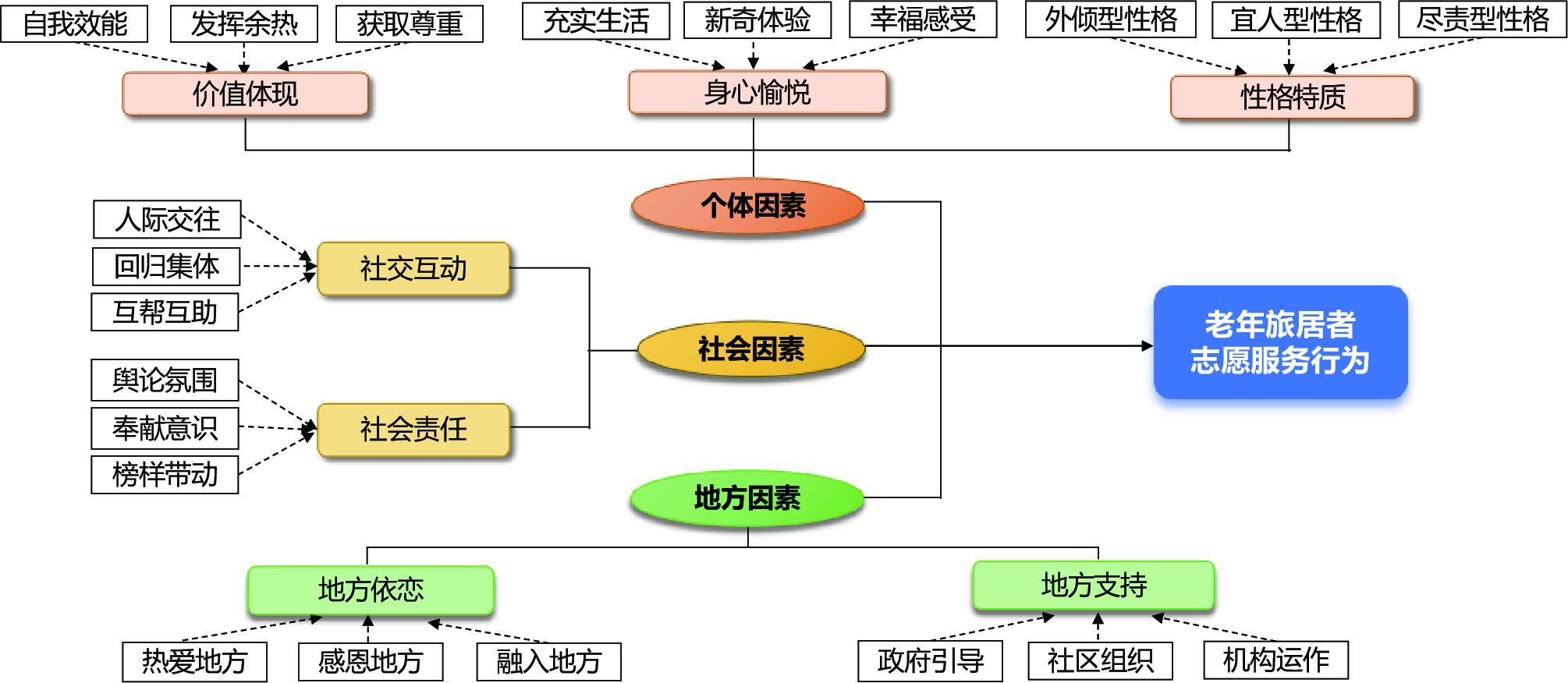 The seasonal migration of elderly sojourners constitutes a unique "leisure-volunteering" practice field against the dual backdrop of population aging and enhanced spatial mobility. Adopting a mobility perspective encompassing spatiotemporal mobility, social-relational mobility, and the mobility of identity and meaning, this study developed a theoretical framework for the volunteer service behavior of elderly sojourners. Taking Sanya City, Hainan Province, as a case study, in-depth interviews with 25 elderly sojourners and participatory observations were conducted to examine the influencing factors, processual dynamics, and generative meanings of their volunteer service behavior. The findings reveal that 1) this behavior is influenced at three levels—individual, social, and place—through seven factors: value embodiment, physical and mental pleasure, personality traits, social interaction, social responsibility, place attachment, and place support. It emerges as a composite practice shaped by the interaction of individual pursuits, social connections, and spatial empowerment, forming a multidimensional explanatory framework of "Individual Needs—Social Networks—Spatial Environment." 2) Behavior evolves in three stages: Initiated by leisure experiences, it transitions from sporadic spontaneity to standardized and regular engagement. Driven by place-based emotions, this develops into deep participation and conscious action. Following the logic of "adaptation—integration—emotional bonding," elderly sojourners establish profound connections with the local socio-spatial context, transforming from passive "environment enjoyers" into active "co-constructors of the city" and reconstructing human-place relationships. 3) Behavior is not a simple sum of influencing factors, but results from the synergistic interaction of individual, social, and place-based factors. Four core mechanisms of human-place interaction—flexible matching of demand and resources, accumulation of cross-regional social capital, coupling of individual and social values, and place attachment as a driving force—collectively propel its generation and continuous evolution. This study transcends the narrow view of elderly migration as mere retirement or consumption behavior. Volunteer mobility services demonstrate the strong agency and adaptive resilience of the elderly in new environments. Moving beyond traditional individualistic paradigms, it emphasizes that this behavior is essentially the mutual constitution of individual agency and local socio-spatial contexts, achieving "bidirectional empowerment"—injecting new meaning into the elderly's life course while flexibly supplementing local governance systems. This study offers a new perspective for understanding the local integration of mobile populations in an aging society. By integrating volunteer service behaviors into the study of elderly mobility, this research enriches active aging theories while extending the conceptualization of mobility to the micro level.