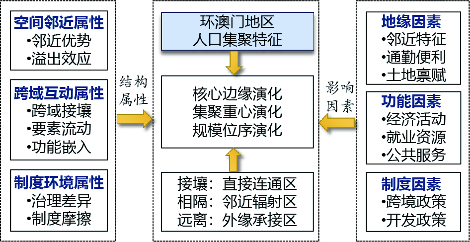 Cross-border metropolitan fringes are critical spaces wherein geographical proximity, functional interactions, and institutional differentiation intersect to reshape regional population structures. Under the integrated development strategy of the Guangdong-Hong Kong-Macao Greater Bay Area, the Zhuhai-Macao fringe area has gradually evolved into a representative case of cross-border population agglomeration. Existing studies have predominantly focused on macroscale urban systems or single driving factors. However, research on population agglomeration at the township scale in boundary regions remains limited. The spatiotemporal evolution and multidimensional mechanisms of population agglomeration have not yet been sufficiently explored.. To address this gap, this study systematically examines the spatial evolution and driving mechanisms of population agglomeration in the Zhuhai-Macao fringe area from 2000 to 2020. Based on data from the 2000, 2010, and 2020 national population censuses, combined with multi-source spatial datasets, this study constructed a township-level analytical framework. A three-dimensional analytical framework integrating geographical, functional, and institutional dimensions was established to interpret the mechanisms of population agglomeration. A spatial classification system comprising directly connected, adjacent radiation, and peripheral receiving zones was developed based on the cross-border accessibility and spatial proximity. The population concentration index, rank-size distribution analysis, standard deviational ellipse, and geographical detector model were employed to measure the spatial structure and quantify the explanatory power of different driving factors across stages. The results reveal several key findings. 1) The total resident population in the Zhuhai-Macao fringe area increased from approximately 1.34 million in 2000 to 2.45 million in 2020, while the overall spatial pattern evolved from a monocentric structure concentrated in the eastern core to a polycentric configuration characterized by a stable core, a strengthened intermediate belt, and an expanding periphery. Both the concentration and imbalance indices declined over time, indicating a gradual weakening of excessive concentration; however, the rank-size structure exhibited stage-specific fluctuations, suggesting structural adjustments within a relatively stable hierarchical system. 2) Significant spatial differentiation emerged among zone types. Directly connected zones such as Gongbei and Hengqin maintained strong agglomeration advantages; adjacent radiation zones, such as Qianshan, Nanping, and Meihua, experienced rapid growth and became secondary population clusters; and peripheral receiving zones expanded steadily with land and industrial support but remained relatively less dense. 3) The driving mechanisms of population agglomeration display a clear stage-based transformation. In 2000, geographical factors-particularly land endowment and locational accessibility-had the highest explanatory power. By 2010, functional elements such as employment resources had become increasingly important, facilitating spatial redistribution beyond the traditional core. By 2020, institutional factors demonstrated a strengthened explanatory capacity, while the explanatory power of traditional geographical and functional indicators showed an overall declining trend and a narrowing gap among the variables; this indicates that population agglomeration in the later stage was no longer dominated by a single factor but was shaped by the coordinated adjustment of geographical conditions, functional capacities, and institutional arrangements. These findings enrich the understanding of population agglomeration mechanisms in cross-border adjacent regions by introducing an integrated analytical framework that combines geo-function and institutions at a fine spatial scale. This study highlights the dynamic interplay between the structural decline in traditional location-based advantages and the increasing role of institutional coordination in shaping spatial restructuring. The results provide empirical evidence for optimizing cross-border corridor development, improving public service allocation, and enhancing multilevel collaborative governance in the Greater Bay Area.