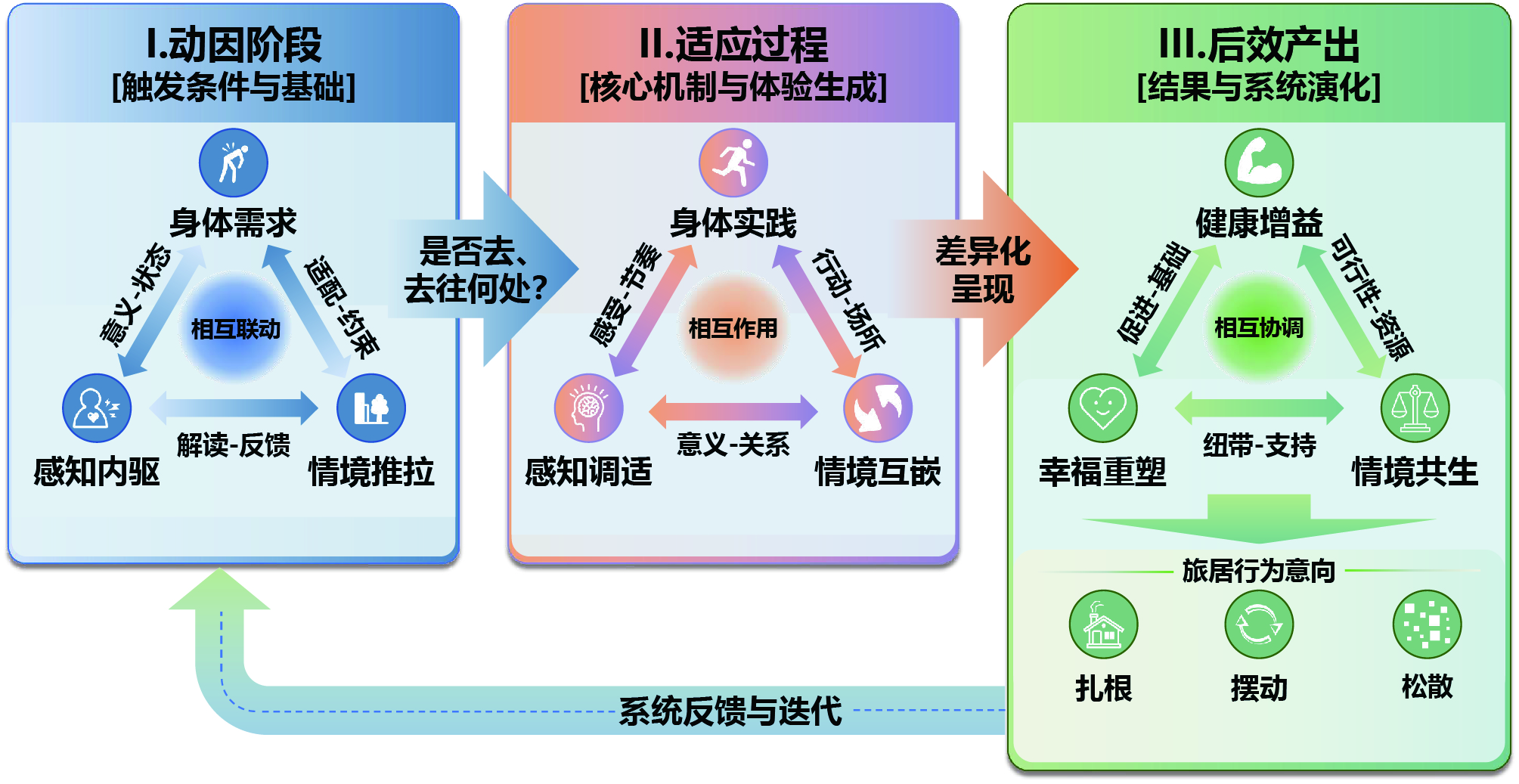 Against the intensifying trend of global population ageing, senior residential tourism (SRT) has become an increasingly salient later-life practice that combines spatial mobility with in situ adaptation. To systematically clarify its behavioral logic, this study adopts an embodied perspective and, following the motivation-process-aftereffects structure, conducts a structured synthesis of existing studies. On this basis, an analytical framework is developed that centers on the dynamic interplay among three interdependent dimensions—body, perception, and context—across the entire SRT trajectory. The main findings of this study are as follows. (1) In the motivation stage, SRT decisions are shaped by the joint influence of bodily needs, perceptual drives, and contextual push-pull factors. Bodily needs constitute the foundational drivers and are primarily reflected in health maintenance and comfort compensation. Perceptual drives capture deeper motivational forces, including escape from everyday fatigue and routine constraints and pursuing self-realization. Contextual push-pull dynamics reflects comparative evaluations between places of origin and destinations, through which individuals weigh differences in conditions and constraints as well as the perceived balance of benefits and risks. Together, these forces contribute to the emergence of residential tourism intentions and their translation into concrete decisions. (2) In the process stage, cross-regional adaptation is characterized by sustained interaction among bodily practices, perceptual adjustment, and contextual embeddedness, through which older adults seek a relative balance between mind and body states and the surrounding environment. Bodily practices tend to evolve from passive activation in the initial period to more agentic forms of construction and active expression as daily rhythms become stabilized and routines are re-established. Perceptual adjustment typically shifts from novelty and ambivalence toward familiarity and a sense of belonging, reflecting a gradual renegotiation of emotions and meanings in everyday life. Contextual embeddedness emerges through ongoing adaptation to both the physical environment and social relationships. These dimensions remain interdependent, making adaptation an ongoing interactive process rather than a linear transition. (3) In the aftereffects stage, health gains, well-being reshaping, and contextual symbiosis are produced through interactive processes and are further externalized into differentiated behavioral intentions. Such intentions commonly include rooting, pendular living, and loose multilocal living. Moreover, these aftereffects may feedback into subsequent destination choices and patterns of stay, thereby contributing to an iterative cycle of updating over time. By linking motivations, processes, and aftereffects through the embodied interplay of body, perception, and context, this study offers an integrative pathway for understanding the complexity of senior residential tourism. The proposed framework provides a conceptual reference for future research and informs destination development, service provision, and policy optimization aimed at supporting later-life mobility and well-being.