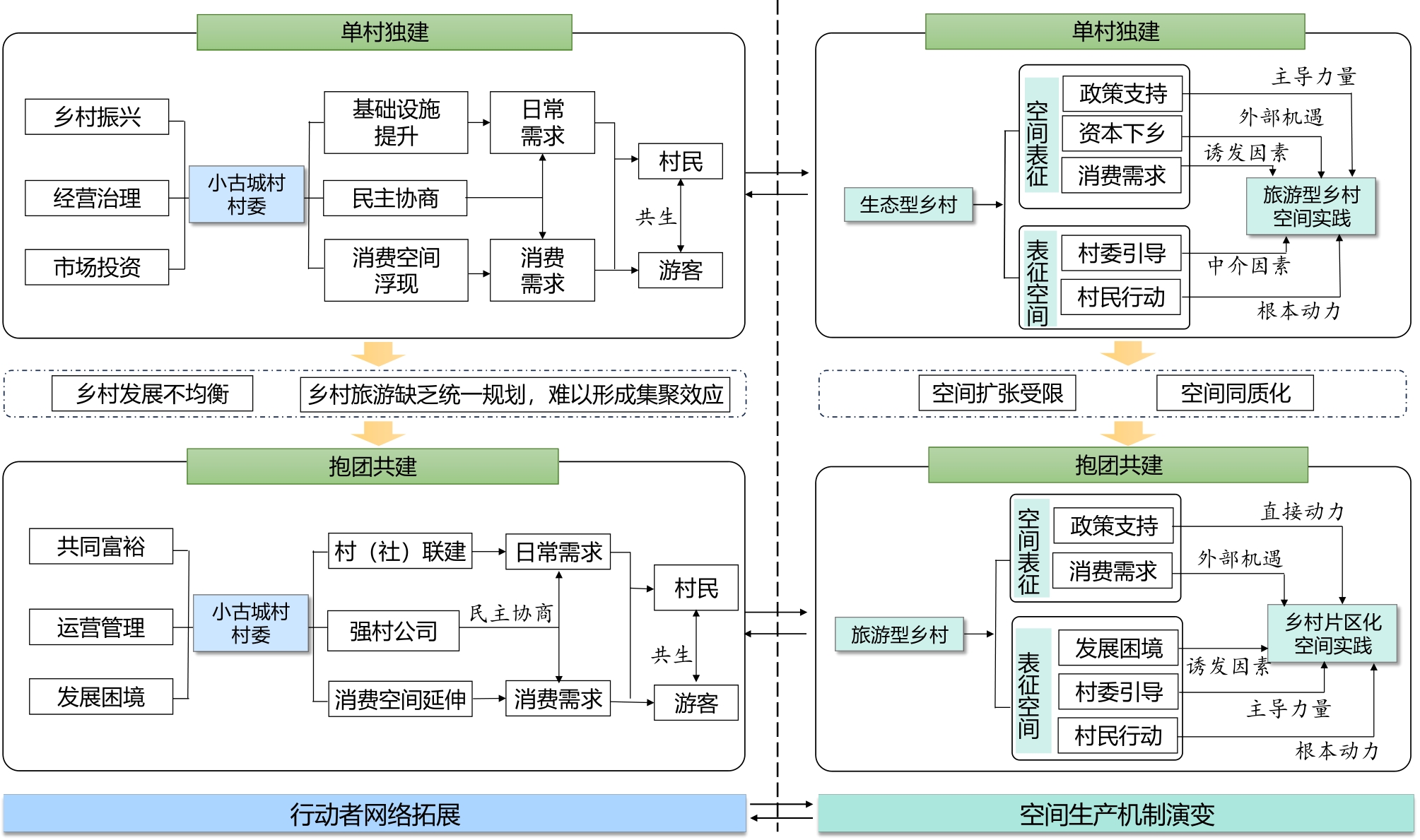 With the advancement of China's Rural Revitalization Strategy, the traditional single-village development model faces resource, industrial, and governance bottlenecks. In response, a clustered rural development model has emerged. Although this practice is underway, academic research on its theoretical logic and internal mechanisms remains nascent and requires in-depth analysis to guide implementation. This study constructs an analytical framework based on the Actor-Network Theory and the Theory of the Production of Space. Using Xiaogucheng Village in Hangzhou as a case study, this study provides an in-depth analysis of the internal mechanisms and evolutionary logic of clustered rural development, aiming to offer theoretical guidance for sustainable rural development. The findings are as follows: (1) Clustered rural development unfolds in three stages: initial start-up, single-village development, and collaborative cluster-building. During the single-village stage, Xiaogucheng Village leveraged early policy advantages and took the lead in development, becoming a key node that radiated influence and guided its surrounding villages and communities. (2) In the single-village stage, propelled by policies, the Village Committee, as the key actor, formed a network. Through its grassroots consultative democracy mechanism of "discussing public affairs among the people," it successfully enrolled human (government, villagers, returning entrepreneurs) and non-human (land, idle farmhouses) actors into environmental renovation, land transfer, and industrial operations, driving the village's transformation from an ecological to a tourism-oriented settlement. However, developmental bottlenecks, a widening gap with neighboring villages, and the national policy orientation toward "Common Prosperity" pushed Xiaogucheng into the "collaborative cluster-building" stage. This has prompted the extension and translation of the actor network. In the new network, the Village Committee remains the key actor, utilizing a consultative mechanism to enroll a wider range of heterogeneous actors in specific rural construction affairs through policy and financial support, planning, and industry operations. (3) Underlying the actor network's evolution is a profound transformation in the logic of spatial production, which evolved from being power-dominated through an interplay of everyday life and capital to a mechanism in which the logic of life is superimposed upon those of power and capital. Initially, spatial transformation was government-led. Initially, rural construction was led by government policy; however, as market demand for rural tourism expanded, capital gradually intervened. The village collective, through consultation, guided villagers to become "participants" in development, mitigating conflicts between capital's logic and villagers' needs and creating a spatial form that integrated life and consumption. To break through bottlenecks and respond to the Common Prosperity agenda, Xiaogucheng united neighboring villages to enhance tourism value by integrating services and upgrading facilities. A 'Strong Village Company' was established to operate industries independently and absorb local labor, effectively strengthening community identity and consciousness. Through consultation, residents of neighboring areas became active agents rather than passive producers of space, linking local culture, daily life, and consumer experience. Xiaogucheng is a microcosm of rural revitalization in China. Its lessons can inform contemporary rural construction. Administrative boundaries can be transcended using demonstration villages as anchors to coordinate geographically connected units for synergistic regional development. Based on consultative democracy, platforms for multi-stakeholder participation should be built and the village collective's coordinating capacity should be strengthened to form a collaborative governance system. Finally, local character should be balanced with marketization by building upon unique rural features, creating distinct brands, and establishing professional operational platforms.