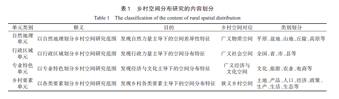 The study of rural spatial distribution, an important aspect of rural research, has great significance in supporting comprehensive rural revitalization and integrated urban-rural development. Previous studies have mainly focused on distribution and factors. With the deepening of relevant research, the connotation of rural spatial distribution has become increasingly rich, where factor study has gradually expanded to an element study, which requires urgent restructure of overview framework. This overview presents the basic concepts of rural spatial distribution at two levels. The evolution of modern research was analyzed in chronological order, and changes in the number of publications, field distribution, and topic distribution in recent years were statistically analyzed using a literature database. Subsequently, based on the two-level meaning of rural spatial distribution, the research content was summarized into four types of units: natural geographic units, administrative regional units, professional characteristic units, and rural element units. Finally, looking ahead to the future research in this area. The conclusions were as follows. The study of modern rural spatial distribution in China is divided into five stages according to the timeline: before the founding of the People's Republic of China, the early years of the People's Republic of China, after the reform and opening up, the early 21st century, and the new era of socialism. Recently, an overall increase has been observed in the number of related publications. A multidisciplinary intersecting system centered on geography and integrating agriculture, economy, tourism, and architecture was formed from a macro-geographic perspective, which encompasses four research themes. Significant differences were noted in rural spatial distribution across different natural geographical units, where the administrative level affects the distribution characteristics and reorganization modes. Meanwhile, professional characteristic units conformed to important geographical spatial distribution patterns in China. Additionally, various rural elements revealed spatial differentiation in terms of land use and industry distance. In summary, it is recommended to establish a research system for natural geographic units as soon as possible; expand multiple-term research; conduct in-depth analysis of the influencing factors of administrative regional units; conduct cross-administrative research; explore the commonalities of rural spatial characteristics; enrich research on professional characteristic units; introduce new elements such as digitization, intelligence, and networking; and strengthen research on various element units. The significant contribution of this study is that it not only systematically sorts out the concept and development process of rural spatial distribution, but also analyzes the research status and integrates the content into four types of units. In addition, it prospectively guides future research and provides solid theoretical and practical guidance.