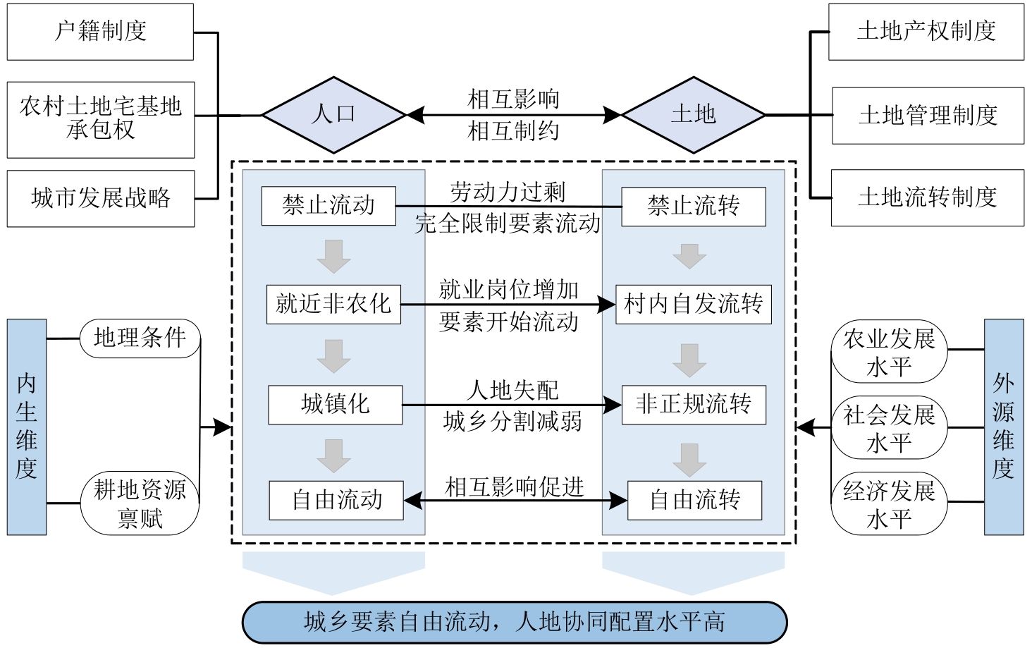 Promoting the coordinated allocation of rural human-land elements is crucial for implementing rural revitalization strategies. Existing research suffers from insufficient theoretical mechanisms, weak specificity in measurement methods, and overreliance on macroscale analysis. Based on the perspective of farmland transfer, this study theoretically analyzes the evolutionary mechanism and influencing factors of human-land coordination, innovatively constructs an indicator to measure the level of human-land coordinated allocation, and conducts an empirical study on the spatiotemporal characteristics and influencing factors of county-level administrative units in Hubei Province as a case study. The results show imbalanced human-land coordination in Hubei Province, with an evolutionary trend generally consistent with the national pattern, exhibiting three distinct fluctuation phases. Spatially, it demonstrates a pattern of "higher in the southeast, lower in the northwest." Spatial autocorrelation analysis indicated high-high clusters in the Jianghan Plain and the counties surrounding Wuhan and low-low clusters in the western mountainous areas. The development level of the land transfer market, level of agricultural mechanization, elevation, and registered population urbanization rate were significant influencing factors, with the effects decreasing in that order. Land transfer market development had a positive effect, whereas agricultural mechanization and elevation had negative effects. The registered population urbanization rate exhibits either positive or negative effects, depending on the region. Spatial heterogeneity analysis revealed new patterns: sensitivity to elevation decreases successively from hilly areas to plains and then to mountainous areas; the effect of registered urbanization rate is nonlinear, turning inhibitory beyond a certain threshold; the promoting effect of land transfer market development is stronger in regions with lower market maturity, reflecting a pattern of initially increasing and then decreasing marginal benefits; the negative effect of agricultural mechanization, most pronounced in plains more suitable for mechanization, reflects a "double-edged" role: it promotes scale operation and land transfer, yet delays land exit by lowering the threshold for agricultural engagement. The study suggests that factor market-oriented reforms should account for the spatial heterogeneity of these four factors, and promote urbanization, improve the social security system, and refine the land transfer market mechanism in a region-specific and phased manner. First, to alleviate topographical constraints, market-oriented reforms of human-land factors should be prioritized in hilly areas suitable for agriculture but with significant terrain variations. Second, regions with higher urbanization levels and more developed land markets should focus on strengthening the social security system to reduce farmers' overreliance on land, whereas areas with greater potential should continue to facilitate the transfer of agricultural labor and improve the land transfer mechanism. Third, a nuanced approach is essential to balance the dual role of agricultural mechanization and steadily promote mechanization, while accelerating the improvement of farmers' social security systems.