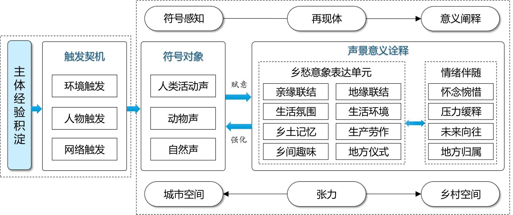 As psychological research has expanded, the hegemony of vision in landscape studies has become increasingly challenging. As the second most critical sensory system after vision, sound has emerged as a key focus of theoretical inquiry. This paper focuses on individuals who have left their rural hometowns (hometown leavers) and used their auditory experiences as an analytical context. Drawing on in-depth interviews and using qualitative research methods such as coding analysis and semiotics, we uncovered the Xiangchou signification system of rural soundscape symbols and their operational mechanisms. We found that the perception of rural soundscapes by hometown-leavers followed a four-stage cognitive model: experience accumulation, representamen triggering, symbol reception and recognition, and meaning interpretation. First, the rural life experiences of hometown leavers formed the foundational prerequisites for awakening their perceptions of Xiangchou-related soundscape symbols. Their accumulated rural upbringing, inherited memories, and other lived rural experiences endowed them with a heightened sensitivity to sound symbols, which enabled seamless perception and reception. Second, during the symbolization of the Xiangchou soundscape, the perceptual trigger for the subject played an equally vital role. The activation and interpretation of sound symbols requires specific triggers. When respondents encounter sounds from their past, the unique timbre, pitch, or loudness of these sounds manifested as representamina, which overlapped with the imagined rural sound symbols stored in their minds. This overlap evoked a vivid sense of "as if it was yesterday," which propelled the symbolization process forward. Third, within the traditional village spaces etched in the memories of hometown leavers, complex sound symbols intertwined to form a distinct rural soundscape system composed of animal calls, natural noises, and sounds of human activity. These concrete sounds in the physical world acted as triggers to bridge the spatiotemporal divide between the soundscape symbols accumulated in the subjects' rural memory, stirring a rich array of rural recollections. Fourth, soundscapes characterized by greater abstractness and associativity focus on awakening and engaging the auditory culture. Through cognitive processing, the subjects transcended mere auditory perception to form interpretive meanings, which elevated the auditory experiences of hometown leavers to the emotional realm of rural sentiments via specific sounds. Following reception and recognition, the meanings of these soundscape symbols gradually solidified and assumed symbolic weight. Receivers with rural experiences endowed sound symbols with interpretive intent, mirroring them into four categories of Xiangchou soundscape units: sentimental attachment, pastoral leisure, rustic amusement, and seasonal busyness, thereby generating emotional resonances such as nostalgia, relief from pressure, longing for the future, and a sense of belonging. Compared with visual landscapes, soundscapes have greater penetrative power, significantly deepening the sense of belonging and identity of the hometown leavers toward their rural roots. This indicates that, during modernization, the eroded intimate connections between people can find psychological compensatory fulfillment through Xiangchou soundscapes. Xiangchou sound symbols allowed the hometown leavers to project their perceptions of their past rural life based on their unique auditory cultural field. Amid fast-paced urban life, their wandering souls were temporarily disengaged, healed, and comforted, thereby achieving a brief return to their spiritual haven through sound. The seasonal busyness soundscape centers on land as its core symbol, carrying the emotional memories and cultural totems of hometown leavers and acting as a spiritual bond for identity affirmation and the reconstruction of belonging. The rustic amusement soundscape, which has childhood games and local rituals as its symbolic anchors, awakened joyful memories and cultural identity, which became an emotional solace for hometown leavers navigating spiritual displacement.