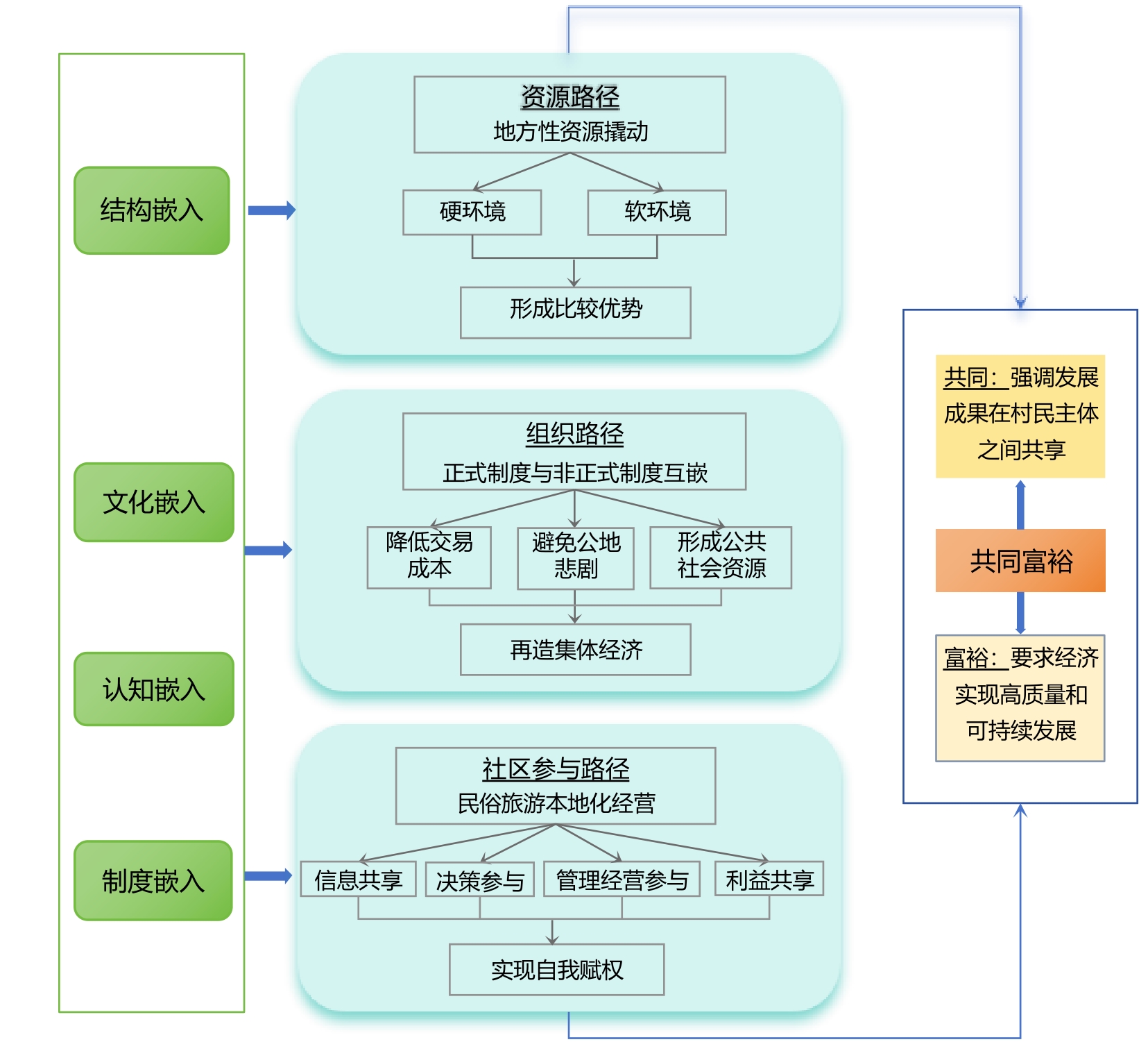 The common wealth in China must benefit everyone, and inhabitants of traditional villages should be included in this process. Owing to historical, social, and natural environmental factors, most traditional villages in China have a poor starting point for development. They are relatively economically backward, making the question of shared prosperity even more complex, arduous, and time-consuming. Rural tourism plays a key role in promoting rural economic development, optimizing industrial structure, fostering social progress, and achieving rural revitalization. It is critical in reviving rural economies, preserving and inheriting rural cultural heritage, fostering rural modernization and change, and helping local communities to increase their income and become wealthy. Although academics have recognized the importance of integrating traditional village cultural resources into tourism with the goal of creating common wealth, most have examined traditional village culture and tourism integration strategies while ignoring the impact of social embeddedness on traditional village tourism development. The central question of how to transform the low-market traditional cultural resources generated by the embedded environment into a sustainable development force for the revitalization of rural distinctive industries needs to be addressed. However, existing research has not investigated the endogenous causes of low integration of village culture and tourism, ignoring the impact of social relations on economic activities; second, there has been insufficient attention paid to how to adapt to local social rules during the integration of culture and tourism. Therefore, this paper employs the case study method to study the traditional festivals of Huanggang Dong Village in Qiandongnan, Guizhou Province, to explain two questions: one is the root cause of the non-economic behaviors of villagers in traditional villages under the structure of 'embeddedness' in the integration of culture and tourism, and secondly, whether the endogenous forces under the context of 'embeddedness' can achieve the marketization of tourism development. The main findings of this paper are that Huanggang Dong Village inhabitants' economic behavior in traditional festivals is influenced by multiple embeddedness; structural and institutional embedding affect residents' non-economic behavior, whereas cultural and cognitive embedding influence residents' non-economic behavior. Overall, the conflict of multiple embeddedness impacts the effectiveness of the cultural and tourism integration project, as well as the realization of common prosperity for the people. The main contribution of this paper is to empirically demonstrate the importance of multiple embeddedness in terms of providing local resources for cultural and tourism integration, paving the way for the development of a collaborative economy, and empowering community participation. Moreover, this paper makes recommendations for local governments to consider the social and local nature of the villages in which they are located, to update the village value and target orientation, and to shift from market-driven economic growth to the presence of social human values and practical needs. Furthermore, it is necessary to consider how to employ internal and external forces in the holistic development of traditional villages, as well as to set 'common prosperity' as the ultimate goal of cooperative action, to fully exploit the advantage of 'embeddedness.'