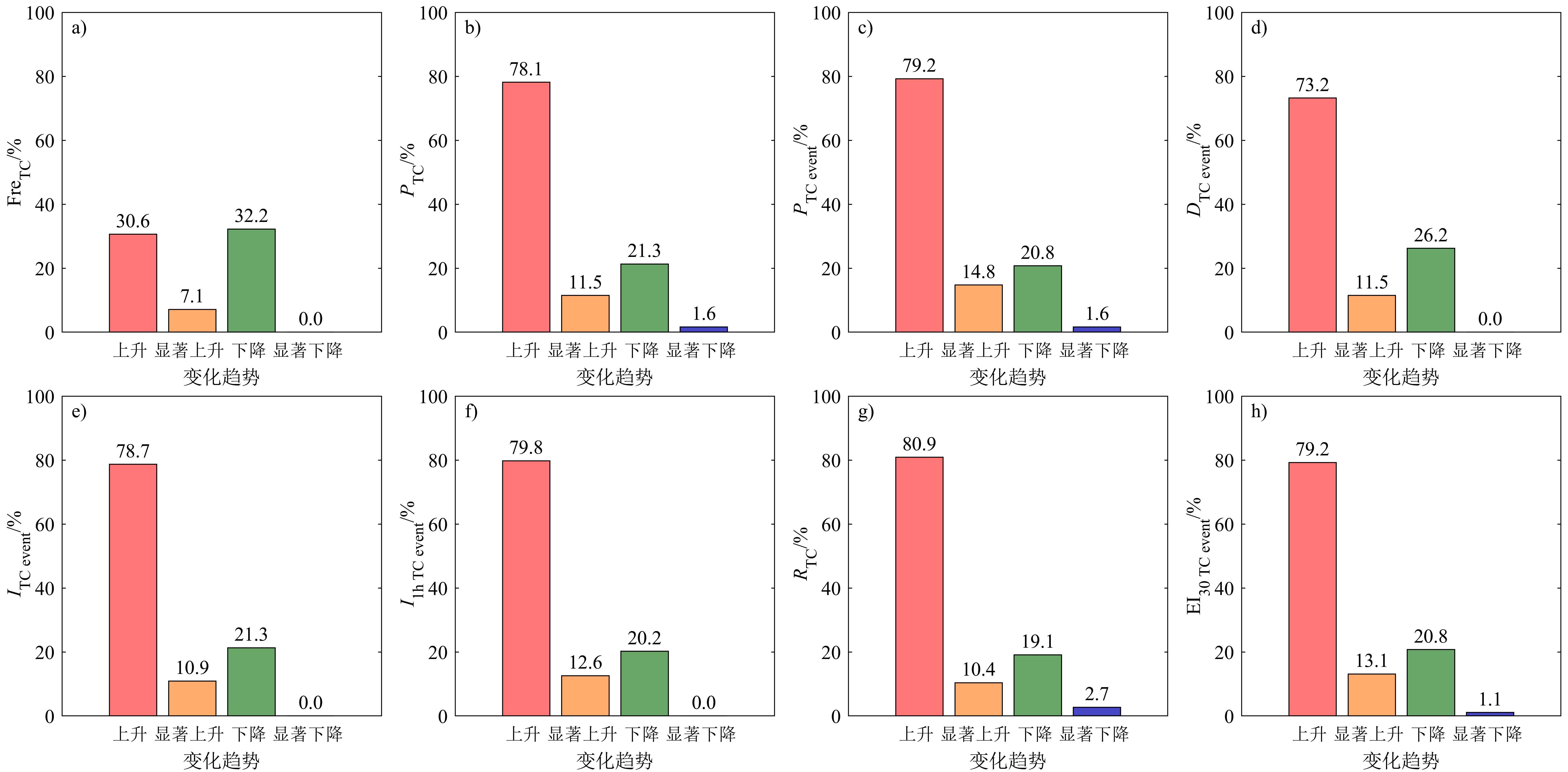 Tropical cyclones frequently affect China. However, tropical cyclone rainfall studies in China have mostly focused on the characteristics of and variations in annual rainfall; research on the tropical cyclone rainfall event characteristics and trends remains relatively scarce. Tropical cyclone rainfall is often highly erosive, which negatively impacts regional water erosion processes. However, almost no research has been conducted on the rainfall erosivity of tropical cyclones in Chinese Mainland. The hourly rainfall and tropical cyclone path data from 1,097 meteorological stations affected by tropical cyclones in Chinese Mainland were analyzed from 1981 to 2020. The basic characteristics of and spatiotemporal variations in the tropical cyclone rainfall and rainfall erosivity in Chinese Mainland under climate change were analyzed. The main findings were as follows: 1) The furthest station affected by tropical cyclones in Chinese Mainland was located in northeastern China, 1,228 km away from the coastline. The average annual contribution of tropical cyclone rainfall to the total rainfall per station was 9.14% for stations in areas with frequent tropical cyclones (Shanghai, Zhejiang, Fujian, Guangdong, and Hainan). Tropical cyclone rainfall contributed 11.85% on average to the annual rainfall erosivity. Less than one tropical cyclone rainfall event occurred per year in the northern regions. However, the average annual contributions of tropical cyclone rainfall to total rainfall and rainfall erosivity in this area were 14.16% and 17% during cyclonic years, respectively, with the highest contributions of 32% and 72%, respectively. Tropical cyclone rainfall, when occurring in northern regions, may pose higher risks of erosion and danger to humans. 2) Tropical cyclone rainfall in Chinese Mainland tended to increase with increasing rainfall amount, duration, intensity, and erosivity. The tropical cyclone event rainfall duration, highest hourly rainfall event intensity, and event rainfall amount significantly increased over the study period, increasing by 3.53%/10 a (P<0.1)、2.89%/10 a (P<0.1)、and 7.3%/10 a (P<0.1), respectively. Tropical cyclone rainfall events in China may pose more severe erosion risks under climate change. 3) The trends in various parameters were analyzed at 183 stations where tropical cyclones were frequent. These stations had been affected by tropical cyclones for over 30 years and experienced more than one tropical cyclone per year. The tropical cyclone rainfall (rainfall amount, duration, and average rainfall intensity per event) and erosivity (highest hourly rainfall intensity and rainfall erosivity per event) indicators increased over time at these stations. The highest hourly rainfall intensity and event rainfall erosivity trended upward over time at 78% of these stations, and more than 10% of all stations showed upward trends in these two indicators (P<0.05), with most of these stations located in northeastern Fujian Province and the coastal regions in Zhejiang Province. Increases in tropical cyclone rainfall amounts and rainfall erosivity will likely further intensify the erosion risk in these regions because the stations with upward trends in the indicators are mainly located in densely populated and developed coastal regions. The water erosion risk posed by extreme rainfall induced by tropical cyclones in Chinese Mainland will further increase under climate change. The implementation of targeted soil and water conservation measures should be strengthened, regardless of whether tropical cyclone rainfall is frequent, in areas affected by tropical cyclones in Chinese Mainland.