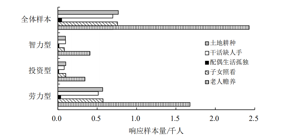家庭“心理 成本”指数 | 目前您在老家操心的事情:老人赡养、子女照看、 配偶生活孤独、干活缺人手、土地耕种和其他各项 记为1分,6项得分总和,得分范围0~6 | 均值 | 2.45 | 2.32 | 2.28 | 2.51 | ||