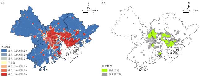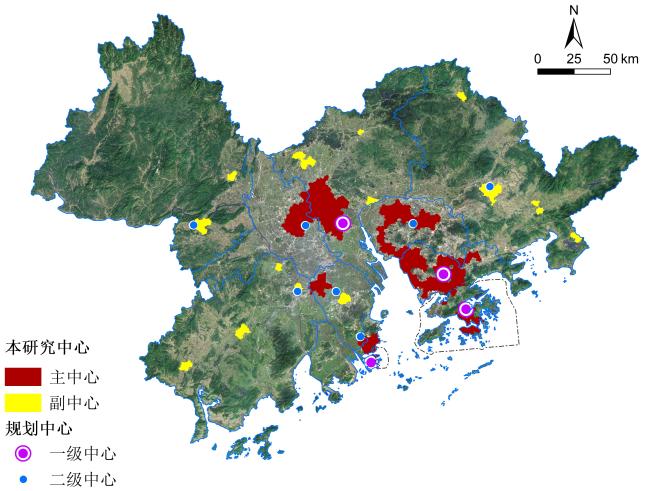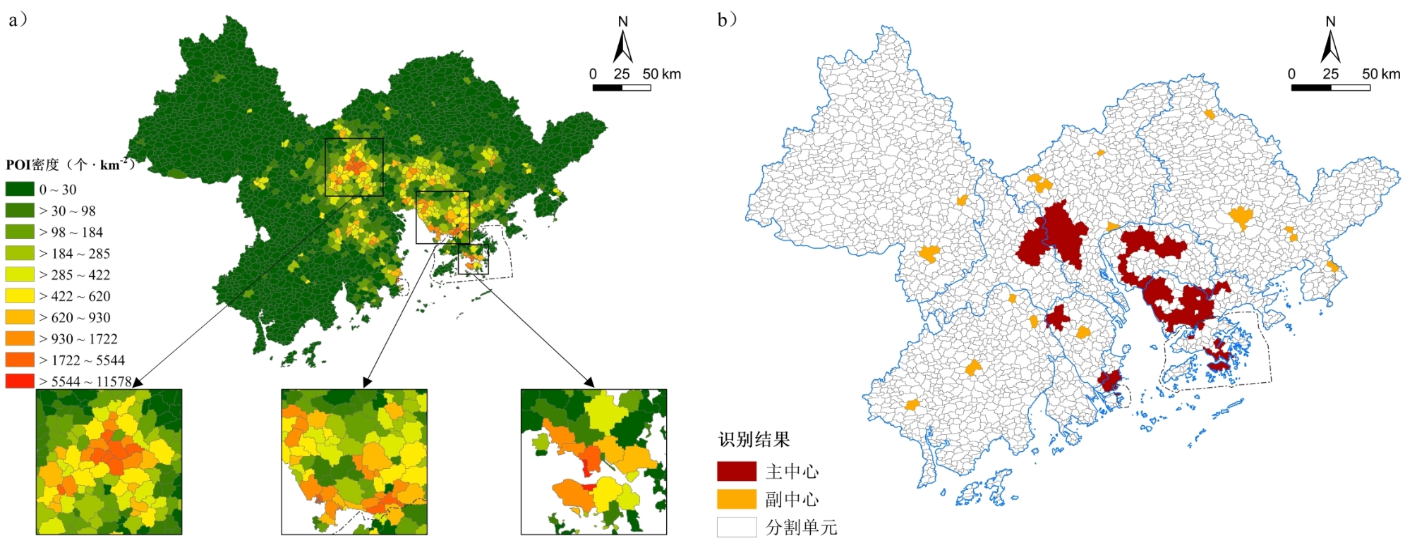 图2 粤港澳大湾区主中心与副中心分布(a. 基于珞珈一号数据划分的空间单元内POI密度;b. 粤港澳大湾区主副中心识别结果)Fig.2 The distribution of main centers and sub-centers in the Guangdong-Hong Kong-Macao Greater Bay Area (a. POI density in space units based on Luojia1-01 data; b. Identification result of the main and sub-centers in the Guangdong-Hong Kong-Macao Greater Bay Area) |