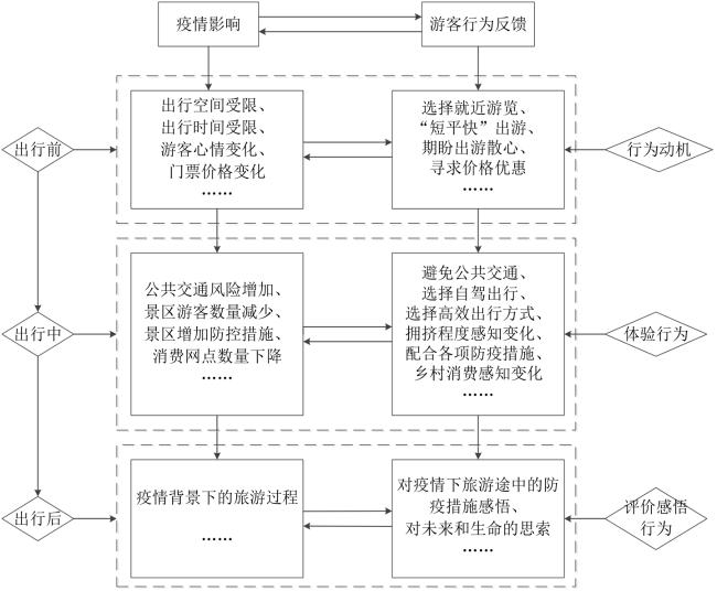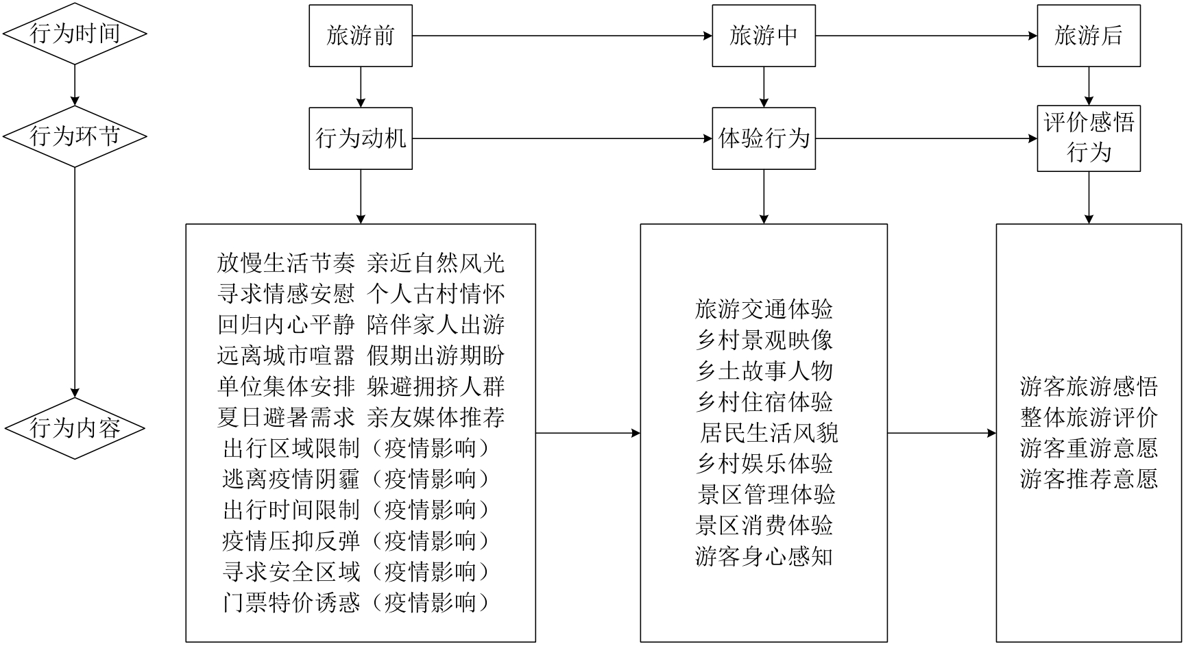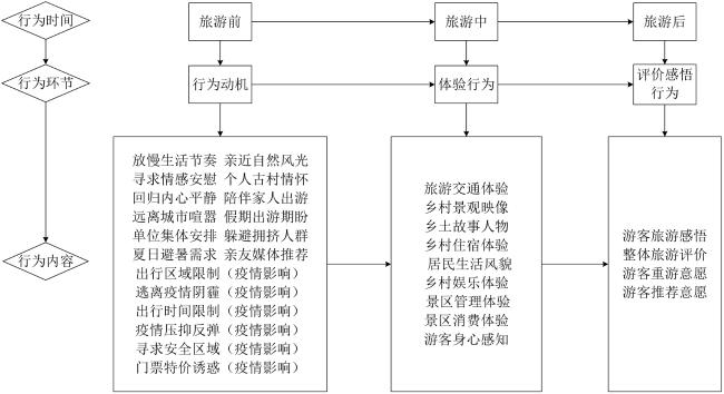Tourism is a sensitive industry that is extremely vulnerable to crisis situations. The development of China's tourism industry was halted altogether after the massive outbreak of COVID-19 in early 2020. Entering the phase of normalization of epidemic prevention, rural tourism becomes the main force of tourism recovery. This study uses online travelogues to determine the behavioral changes of rural tourists before and after the occurrence of COVID-19. The study applies rooting theory and constructs a rural tourism behavior model based on the temporal logic of tourism progress. The following results were obtained: First, rural tourism behavior includes three stages (behavior motivation, experience behavior, and evaluation behavior), and its framework can be organized into four aspects (behavior time, behavior link, behavior content, and behavior level). Second, while the COVID-19 outbreak poses a serious impediment, it also brings development opportunities. Rural tourism, as the "dark horse" of tourism recovery speed, has obvious advantages. The vast space and good environment of the countryside in the post-epidemic era have become an ideal tourist destination for the urban population during the epidemic. Six rural tourism objectives emerged during the epidemic: epidemic suppression rebound, escape from the epidemic haze, the lure of ticket specials, search for safe areas, travel time constraints, and travel space constraints. Third, rural tourism's tourist experience behavior in the context of the epidemic presents a series of new features, including transportation choice behavior, perceived degree of congestion, and consumption behavior. Changes in the number of visitors to scenic areas, scenic management measures, and scenic consumption places can influence tourist behavior accordingly. Finally, owing to the specificity of the tourism experience process, its physical and mental contradictions and interaction mechanisms are systematic and complex. The contradictions between the need to travel during the epidemic and reality fiercely affect the emotions of tourists, whose emotional expression is more complex and adds a layer to the perception of life. Ultimately, the process of the tourism experience is reflected in the individual, thereby facilitating the visitor's satisfaction of self-growth and discovery. The novelty of this study lies in its research perspective, which takes tourist behavior as an entry point to explore the impact of the epidemic on the behavior of rural tourists from their point of view. The study findings can point to new directions for the tourism industry to achieve market recovery and industry revitalization after the epidemic and guide rural tourism destinations to better assess and respond to changes in tourism demand.