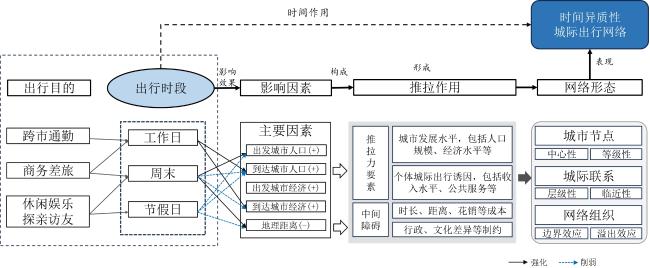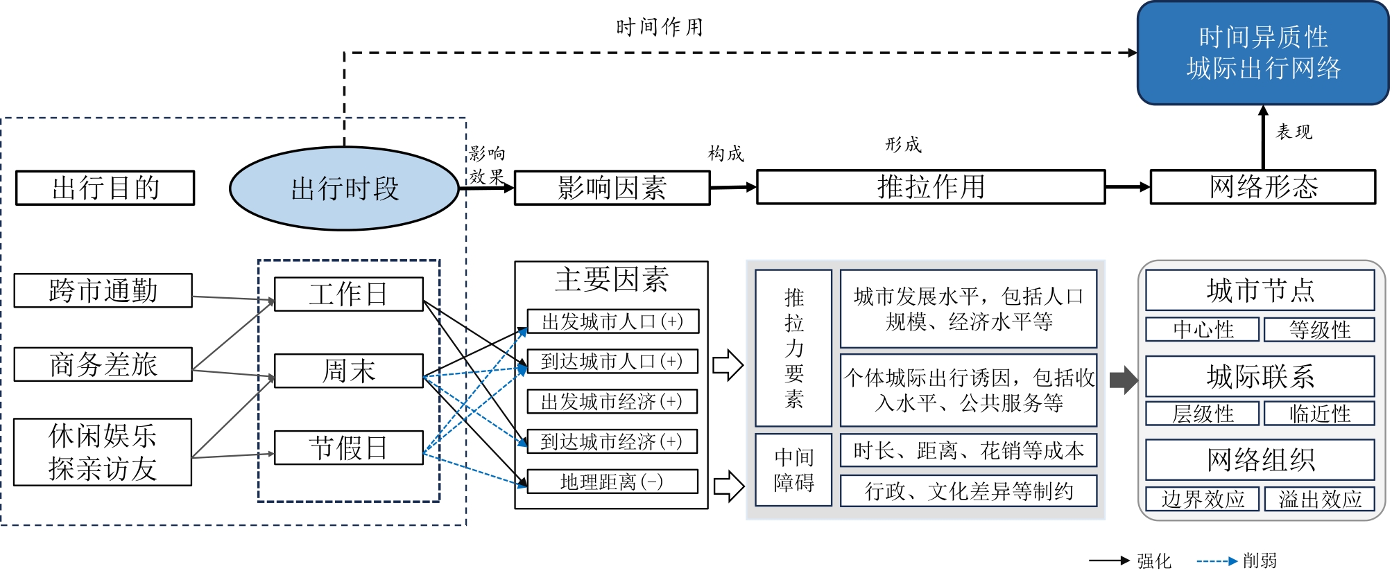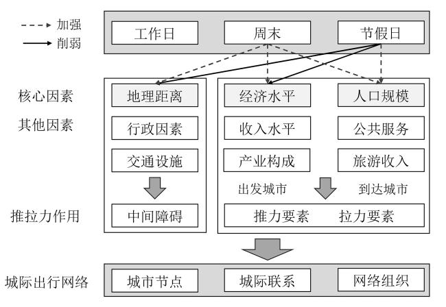 Under the influence of information technology and high-speed transportation networks, which compress space and time, the region's population has achieved large-scale fluidity. Examining the temporal heterogeneity of intercity travel networks and its influencing mechanism can help optimize regional spatial organization and provide a scientific basis for regional integrated development. Based on Baidu migration data from January to April 2023, this study uses a PPML(Poisson Pseudo Maximum Likelihood) gravity model and interaction term testing to compare the scale, pattern, and influencing factors of intercity travel networks during weekdays, weekends, and holidays in the Yangtze River Delta region. The results indicate the following: 1) The intercity travel network in the Yangtze River Delta region exhibits temporal heterogeneity characteristics. During weekdays, intercity travel primarily consists of cross-city commuting and business trips, with the lowest daily average scale. This forms a V-shaped intercity travel structure covering Shanghai, southern Jiangsu, Northern Zhejiang, and Southern Anhui. The positive effects of destination city population size and economic status on intercity travel are enhanced. On weekends, intercity travel is dominated by business trips and leisure activities, and residents tend to take shorter trips, which means that intercity distances pose greater hindrances to intercity travel. During holidays, intercity travel is primarily for leisure and entertainment and for visiting friends and relatives, with the highest daily intensity. The promotional effect of destination city population size on intercity travel is weakened, and intercity travel is less hindered by intercity distances. Compared to the effects of geographical distance, economic status, and population size on the scale of intercity travel during weekdays, travel duration, or geographical distance, tends to pose a greater hindrance on weekends and a lesser hindrance during holidays. The promotional effect of economic status is intensified on weekends but diminishes during holidays. Meanwhile, the promotional effect of population size weakens both on weekends and during holidays. 2) Push-pull factors encompass the level of urban development and the incentives that trigger individual travel. In terms of urban development level, indicators such as population size, economic status, and industrial structure reflect the comprehensive strength and development status of a city, influencing its ability to serve as both a starting and destination point for intercity travel. From the perspective of various individual travel incentives, residents pay more attention to various urban resources such as income levels, public service quality, and tourism resources to meet their personal needs for production and living. The primary types of population movements vary across different time periods, shifting between cross-city commuting, business travel, and leisure and entertainment. As a result, the dominant factors among push-pull elements also change, leading to significant variations in the effectiveness of each factor. Intermediate obstacles are the key factors limiting intercity travel. On the one hand, while the level of integration in the Yangtze River Delta region continues to improve, and transportation facilities are gradually improving, geographical distance remains a crucial intermediate obstacle. On the other hand, administrative and cultural differences between different provinces increase residents' adaptation costs, forming "invisible barriers" that hinder cross-province population interactions. The hindrance posed by intermediate obstacles to intercity travel also varies across different travel periods. The effects of push-pull factors exhibit temporal heterogeneity. The small-world characteristics of the intercity travel network during weekdays are more evident, and the central city has a more prominent structural core status. On weekends, the geographical proximity of the intercity travel network improves, with close "center-hinterland" connections and enhanced inter-provincial boundary effects. During holidays, the overall intensity of the intercity travel network increases, with the most significant increase in medium- and long-distance cross-provincial travel. The provincial boundary effect and spatial proximity effect decrease, weakening the structure of the intercity travel network.