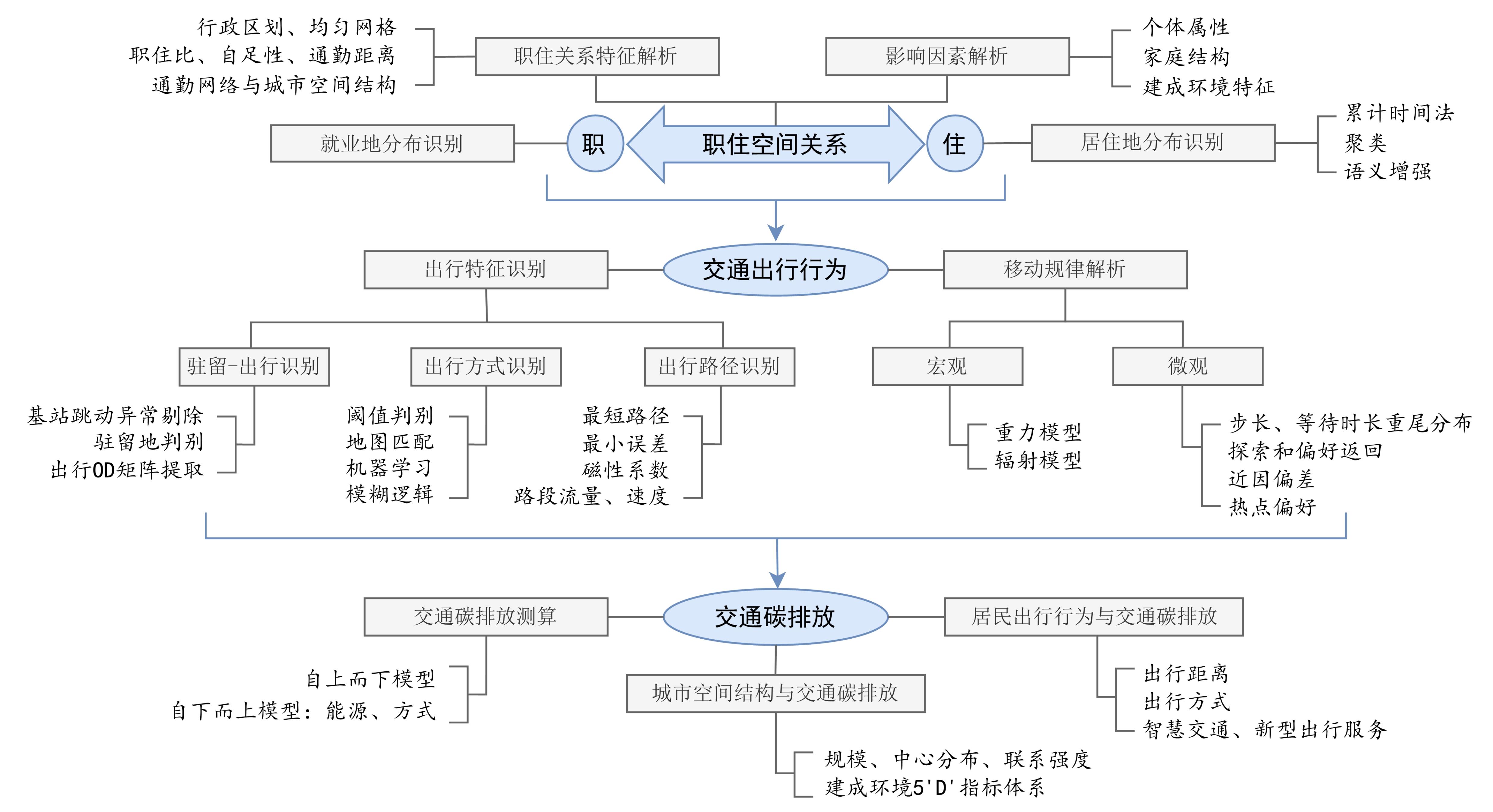 The rapid development of information technology has triggered an explosion of data, marking the era of big data. A wide range of transportation big data has been used in urban space and travel behavior studies since the beginning of this century. Mobile phone signaling data in particular have many advantages: they have prevalent spatial and temporal coverage, high tracking stability, satisfactory resolution, and low cost. The description of urban phenomena and the analysis of their forming mechanisms using mobile phone signaling data are thoroughly studied by previous research. The next course of action is to tackle specific urban problems. This study summarizes the application progress of mobile phone signaling data in job-housing relationships and travel behavior studies, discusses the application prospects of mobile phone signaling data in transportation carbon emissions research based on past applications and the existing literature on low-carbon transportation, and proposes a research framework and several future directions for studies using mobile phone big data to examine job-housing relationships, travel behavior, and transportation carbon emissions. We first provide a brief introduction to the features of mobile phone signaling data in comparison with other commonly used data types, including their type, content, and spatial-temporal resolution. We then review the existing applications in job housing and travel research. Regarding the jobs-housing relationship, prior studies employ mobile phone signaling data to detect the spatial distribution of workplaces and residences of urban dwellers, analyze jobs-housing relationship features and urban spatial structure characteristics, and examine the factors influencing jobs-housing relationships. Regarding travel behavior, studies employ mobile phone signaling data to identify stays and trips, infer trip modes, detect trip routes, and explore the universal laws of human mobility. Next, we also discuss how mobile phone signaling data can be applied to transportation carbon emissions research. Indeed, mobile phone signaling data can be used in the calculation of transportation carbon emissions and analysis of the relationships between urban spatial structure, individual travel behavior, and transportation carbon emissions, and its wide coverage and large sample size can be exploited to fill research gaps and problems that have yet to be resolved using traditional traffic datasets. Finally, we present a research framework underlining the indirect and direct effects of the jobs-housing relationship and travel behavior on transportation carbon emissions. We also propose future directions in study contents and methodological innovations by recommending long time-series longitudinal studies, large-scale comparative studies, and new population and transportation phenomena. We further recommend fusing multi-source big and small data, incorporating machine learning algorithms into traditional statistical analyses, and constructing digital twin models. Examining the jobs–housing relationship, travel behavior, and transport carbon emissions using mobile phone signaling data is essential for clarifying the interactions between urban and regional structures, travel behavior characteristics, and transport carbon emissions. It has important implications for emissions reduction and sustainable development in the context of proposing carbon peaking and carbon neutrality goals.