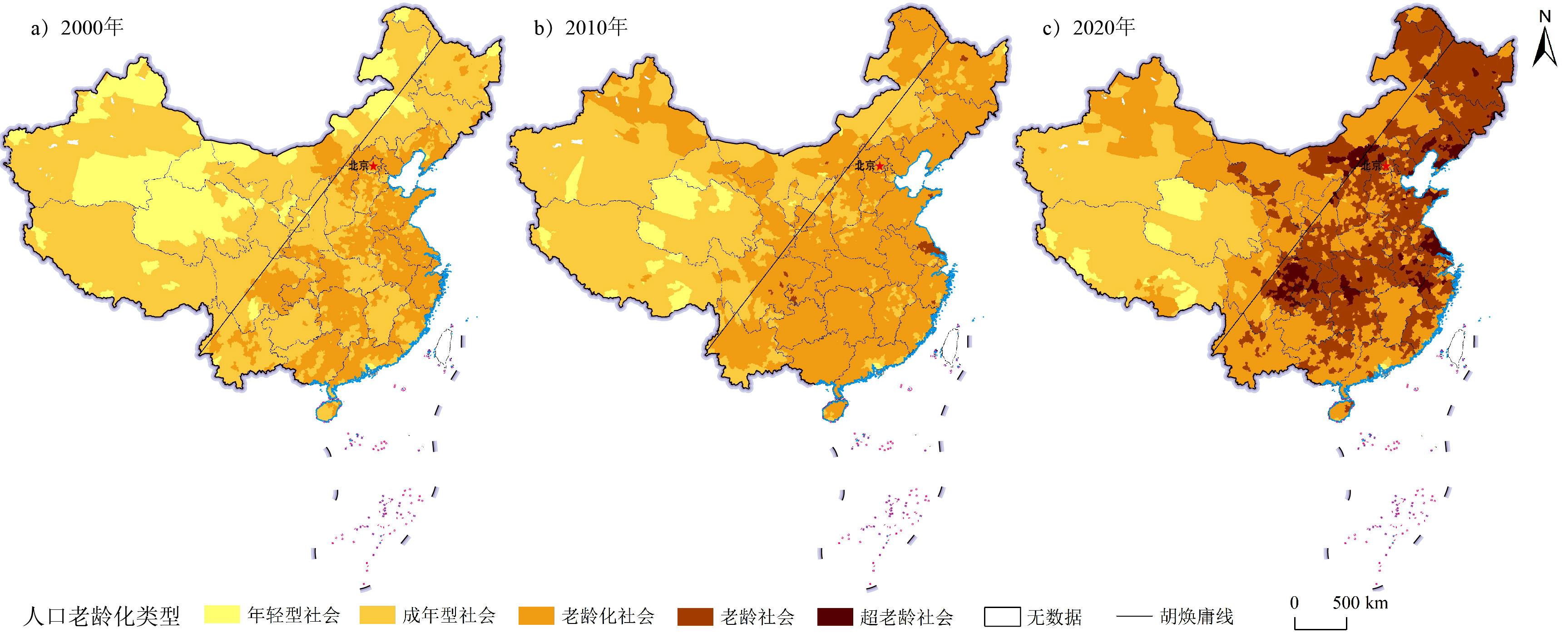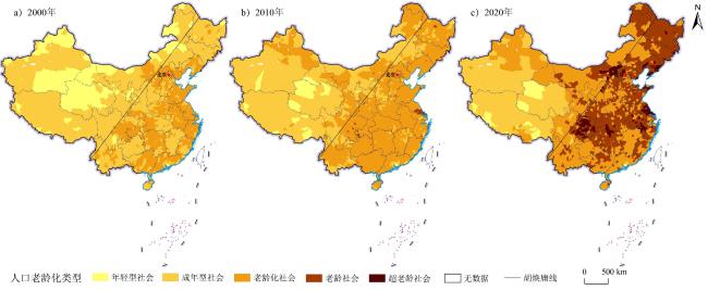 图2 2000、2010和2020年中国人口老龄化类型分布 Fig.2 Distribution of population aging types of China in 2000, 2010, and 2020 |