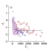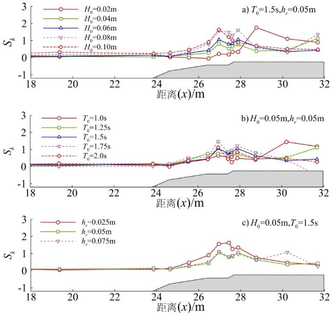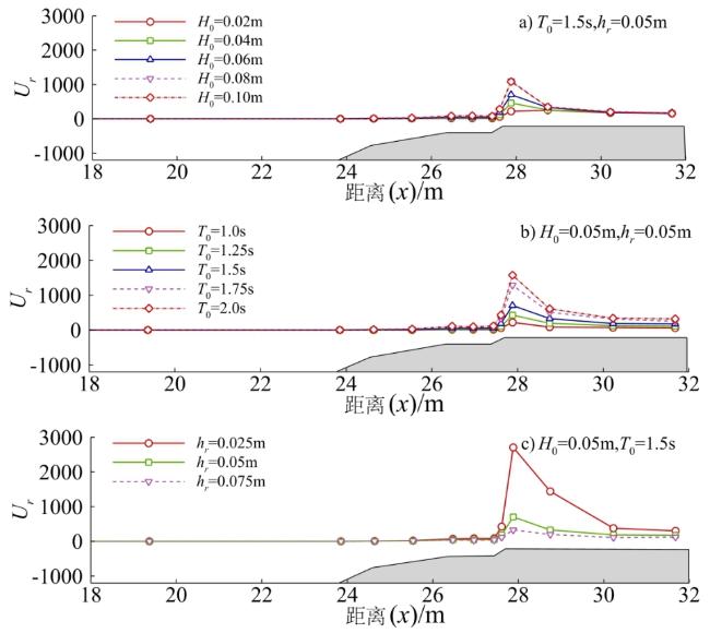 图7 差异坡度岛礁礁坪区域内波浪的偏度(Sk )和不对称度(As )与对应厄塞尔数(Ur )数间的关系Fig.7 Wave skewness(Sk ) and asymmetry(As ) with respect to the local Ursell number(Ur ) for waves on different reef flat |