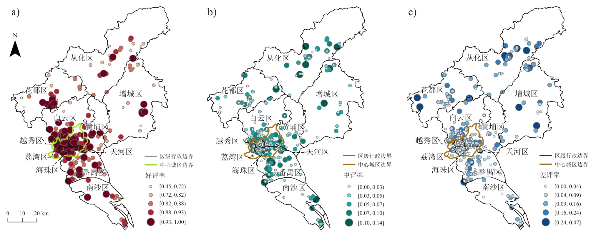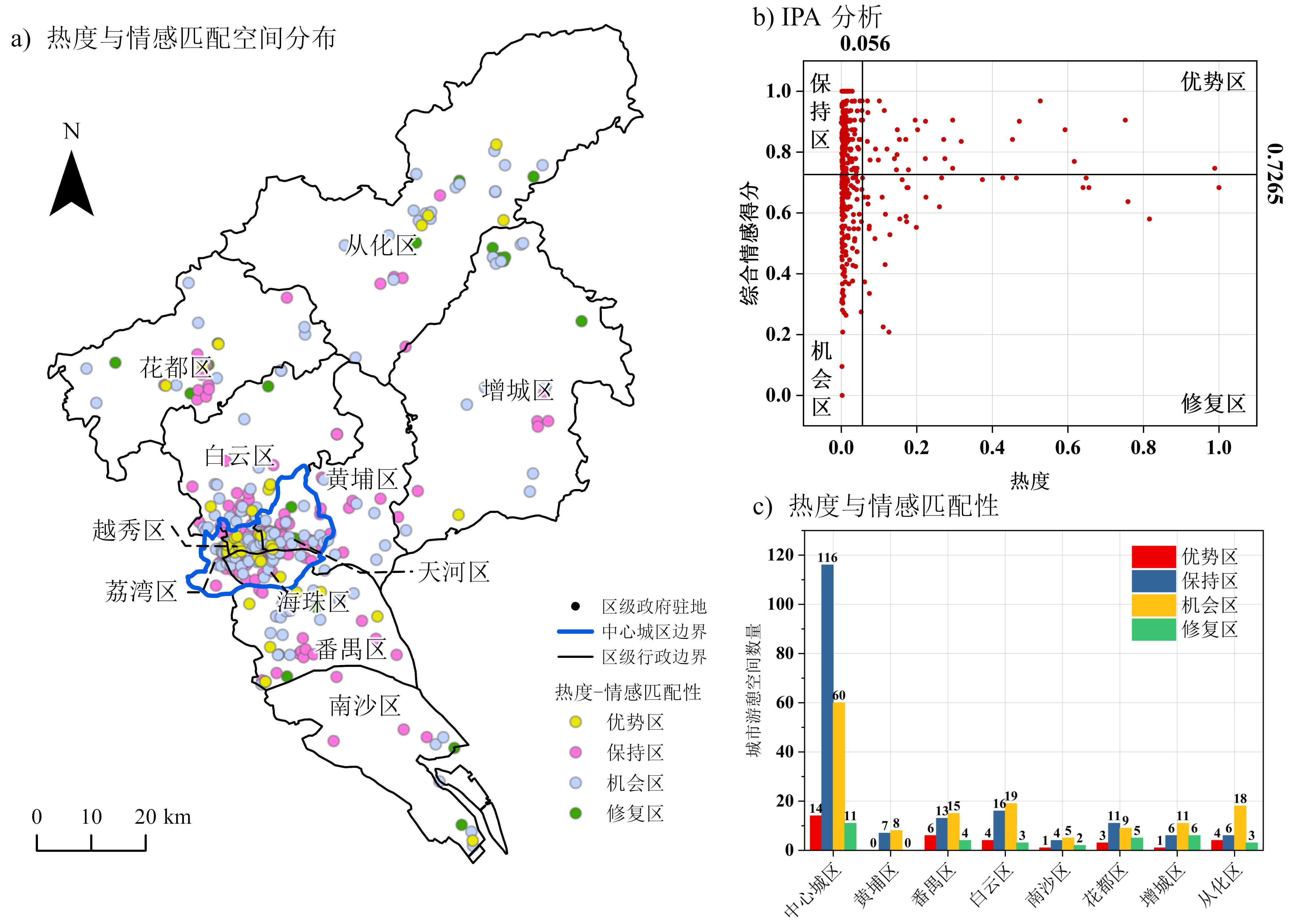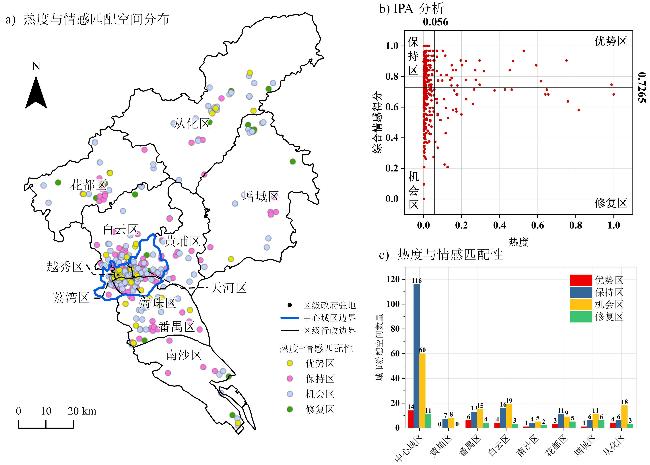 Recreational spaces play a pivotal role in enhancing the quality of national life, fostering physical and mental health, and promoting social interaction. While previous research has predominantly examined the supply side of urban recreational spaces, there is a noticeable gap in the characterization of these spaces based on societal perceptions. Using Guangzhou as a case study, this study harnesses big data sourced from Ma Feng Wo and Ctrip. Based on machine learning techniques, it discerns recreational emotions and synergizes Geographic Information System (GIS) spatial analysis with heat-emotion matching analysis. This approach facilitates a nuanced and precise examination of the structural and experiential characteristics of urban recreational spaces from the perspective of social perception. The objective of this study is to offer informed references for the strategic planning and management of urban recreational spaces. The findings indicate that: (1) The distribution of recreational spaces in Guangzhou exhibits a "core agglomeration, edge dispersion" pattern, characterized by a "one core, multiple centers" configuration. Notably, the central urban region and its proximate suburbs—specifically, the Panyu, Baiyun, and Huangpu Districts—show a marked concentration in both the number and popularity of recreational spaces. In contrast, peripheral urban zones primarily feature government residences, premium ecological recreational spaces, and hot spring resources. These areas—including the Huadu, Conghua, and Zengcheng urban areas, Conghua District's hot spring town, and Paitan town—stand out as secondary hubs in terms of recreational space concentration and popularity. Moreover, recreational spaces situated along waterfronts and in areas with dense road networks tend to follow a "point-axis" distribution model, with a staggering 90.45% of these spaces located within a 1 km radius of the road network. (2) The overall approval rate of urban recreational spaces in Guangzhou is significantly high, evidenced by an average positive emotion ratio of 86.99%. However, there is a marked polarization in terms of popularity, manifesting as a "core-edge" decline in spatial distribution. Recreational spaces that evoke predominantly positive emotions are primarily located in the city center and are proximate to the administrative seats of the Panyu, Baiyun, Huangpu, and Nansha Districts. These areas also record a low ratio of negative emotions. In contrast, neutral and negative emotions are more prevalent in the commercial streets and pedestrian zones of the central city, as well as the suburbs of the Conghua, Huadu, and Zengcheng Districts. A considerable emphasis on "cost performance" is observed across all emotional categories related to Guangzhou's urban recreational spaces, indicating a widespread concern among tourists/residents regarding the balance between the costs of these spaces and their service quality. (3) The congruence between popularity and emotional response in Guangzhou's urban recreational spaces is suboptimal. Spatially, this disconnect can be categorized into three distinct types: the "polarized" pattern in the central city, the "experience enhancement" pattern in the Huadu, Panyu, Baiyun, and Conghua Districts, and the "insufficient supply" pattern in the Zengcheng, Huangpu, and Nansha Districts. These findings provide valuable insights for metropolitan areas aiming to refine the layout and management of recreational spaces. By understanding social demands and experiences, cities can craft a more optimized group perception of urban recreational spaces, thereby enhancing tourists' satisfaction and elevating the well-being of residents.