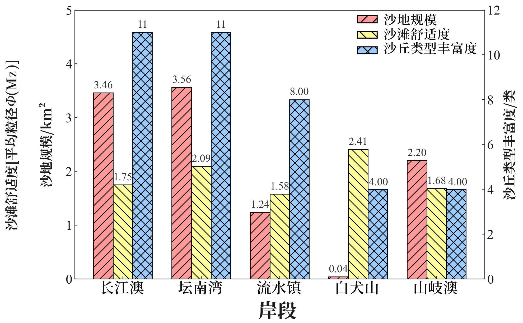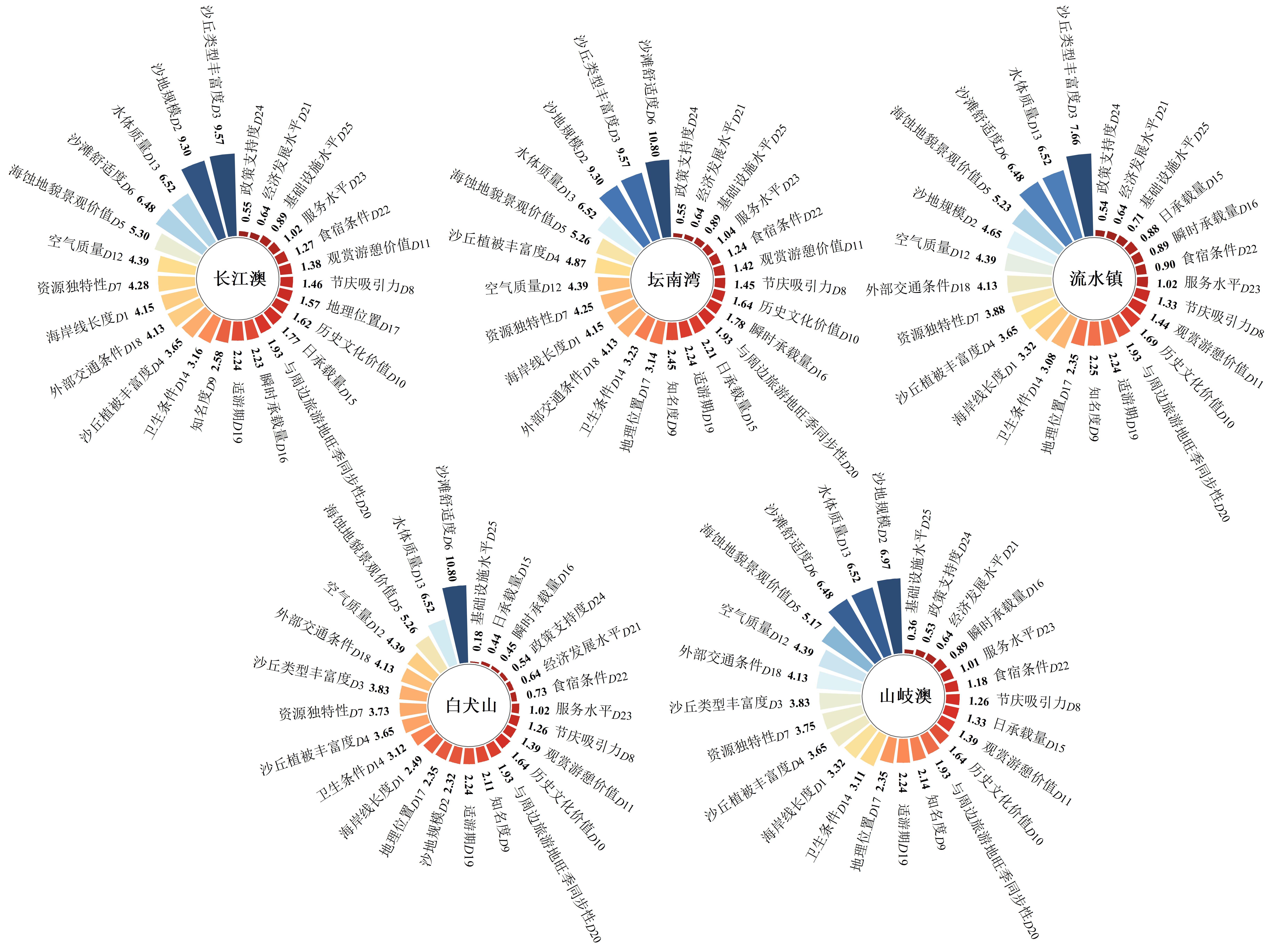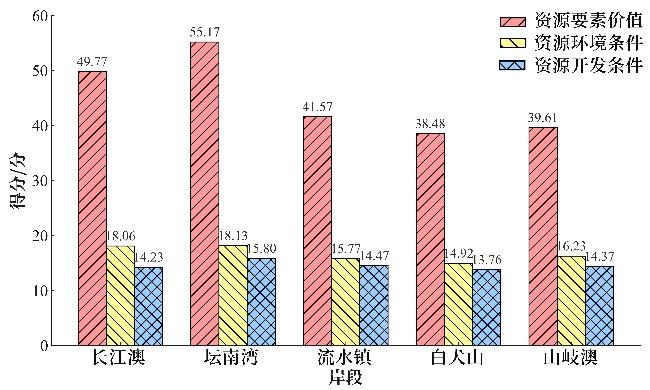 | 评价因子 | 长江澳 | 坛南湾 | 流水镇 | 白犬山 | 山岐澳 |