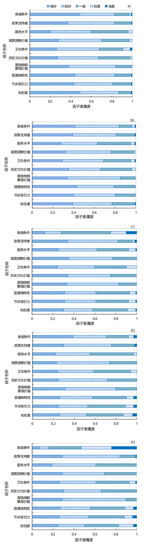 图4 平潭岛各岸段因子模糊得分 Fig.4 Fuzzy scores of factors for each shore segment of the Pingtan Island |