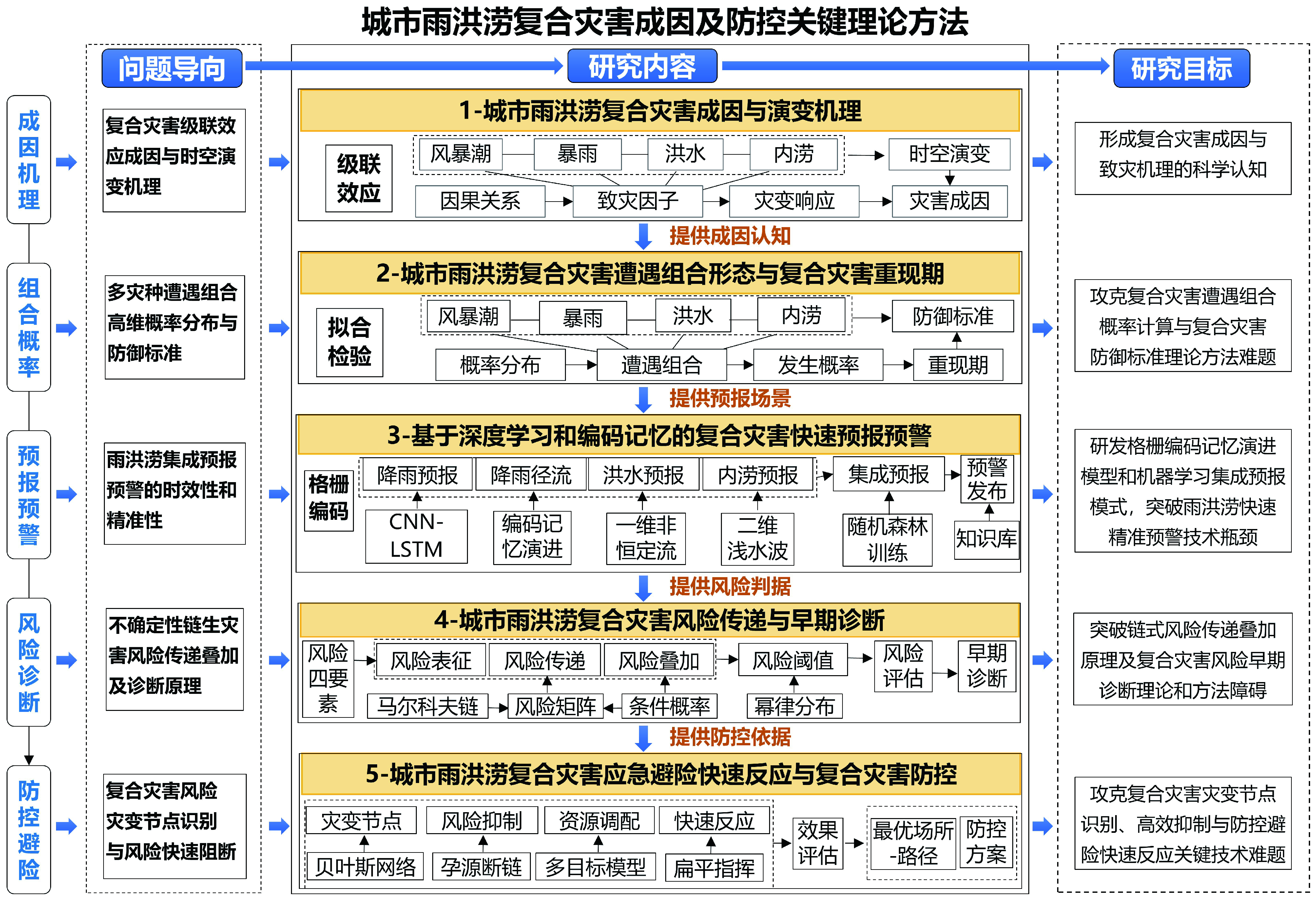 Along with climate change and rapid urbanization, recent urban rainstorm flood events have been presented as compound disasters characterized by rainfall-flood-urban inundation coupling, featuring rapid risk transmission, difficult forecasting, severe disaster situations, and a lack of defense standards. This study identified key scientific issues that need to be addressed in the study of urban rainstorm-flood compound disasters, including coupled integrated forecasting and rapid early warning methods based on the formation mechanism of urban rainstorm-flood compound disasters, the combination probability of urban rainstorm floods encountering each other, the return period and defense standard of compound disasters, the principle of risk transmission superposition, and the rapid diagnosis and suppression mechanism of urban rainstorm-flood compound disasters. Research content and technical routes oriented towards scientific problems were proposed. It is believed that solving the challenges of early warning for urban rainstorm-flood compound disasters, rapid risk diagnosis, and rapid suppression responses are crucial for the prevention and control of urban compound water disasters.