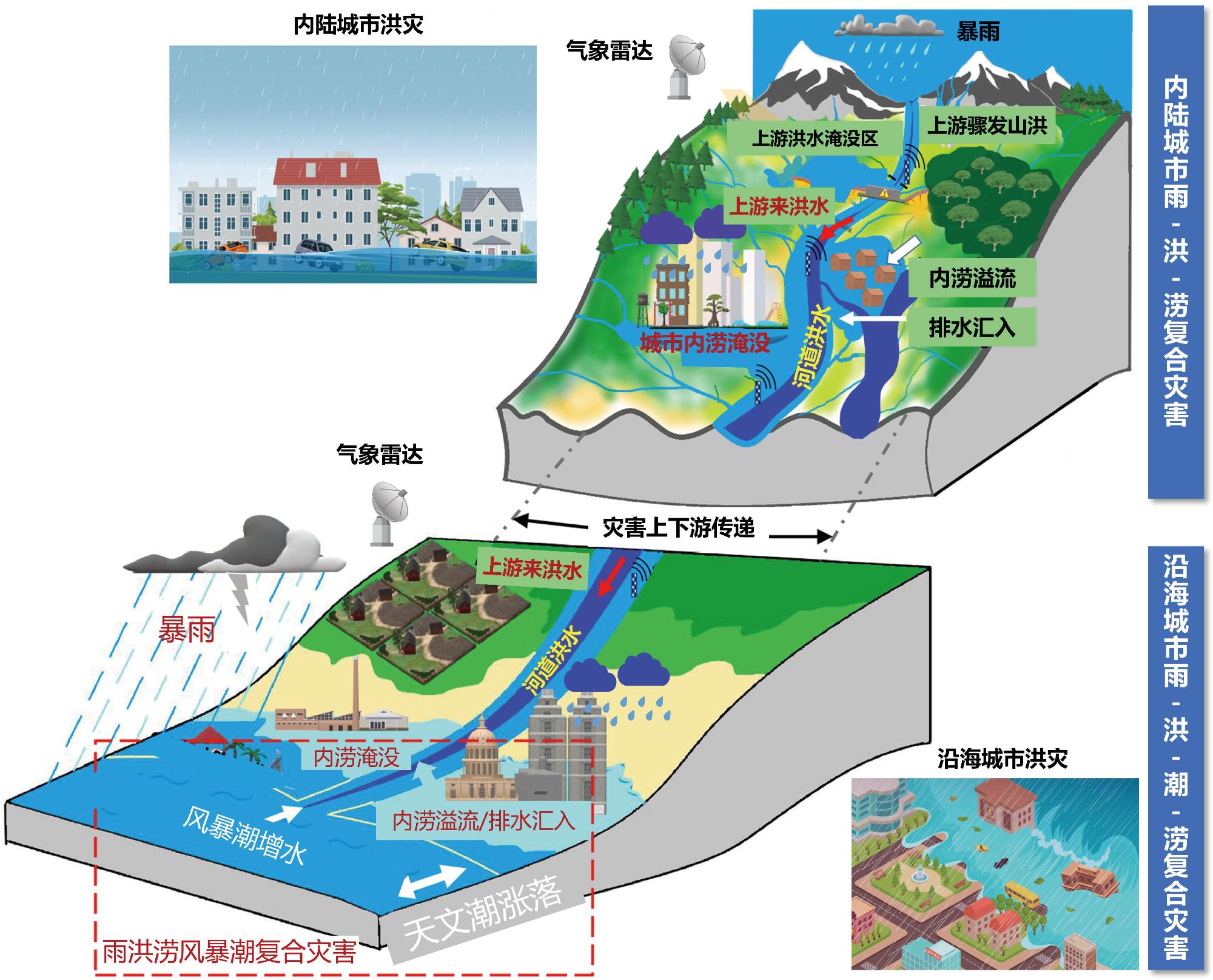图1 内陆城市和沿海城市雨−洪−涝复合灾害示意图(Mishra et al., 2022)Fig.1 Schematic diagram of rain-flood-inundation compound disaster in inland and coastal cities(Mishra et al., 2022) |