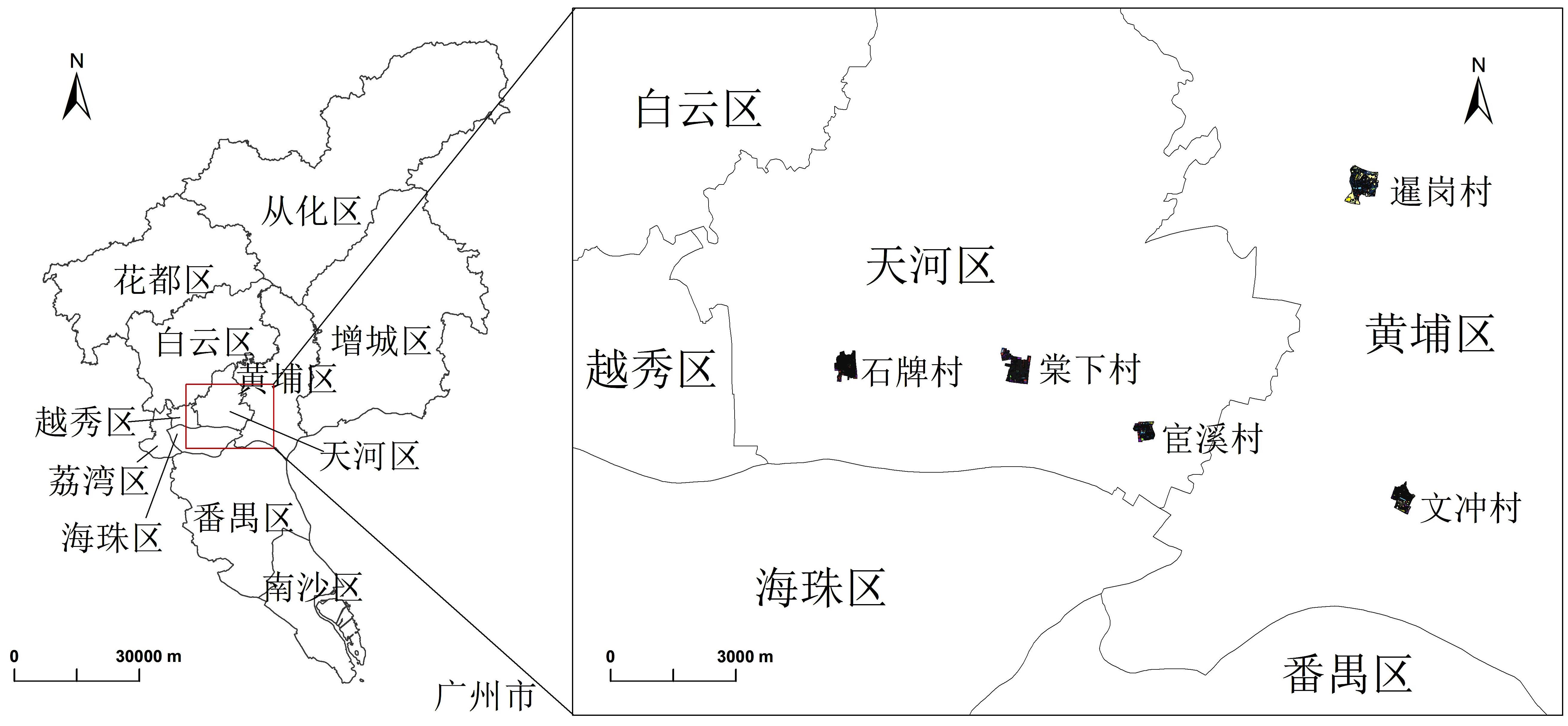 Locations of five typical urban villages in Guangzhou
