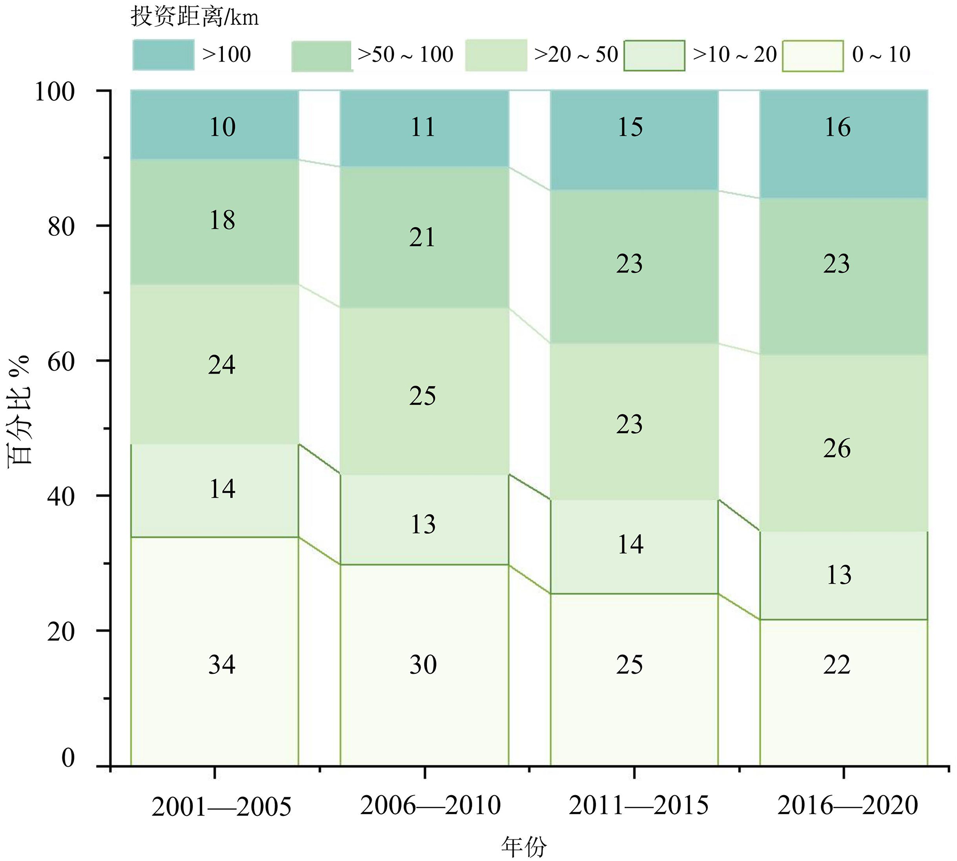 Changes in investment distance of urban and rural industrial networks in the Pearl River Delta from 2001 to 2020