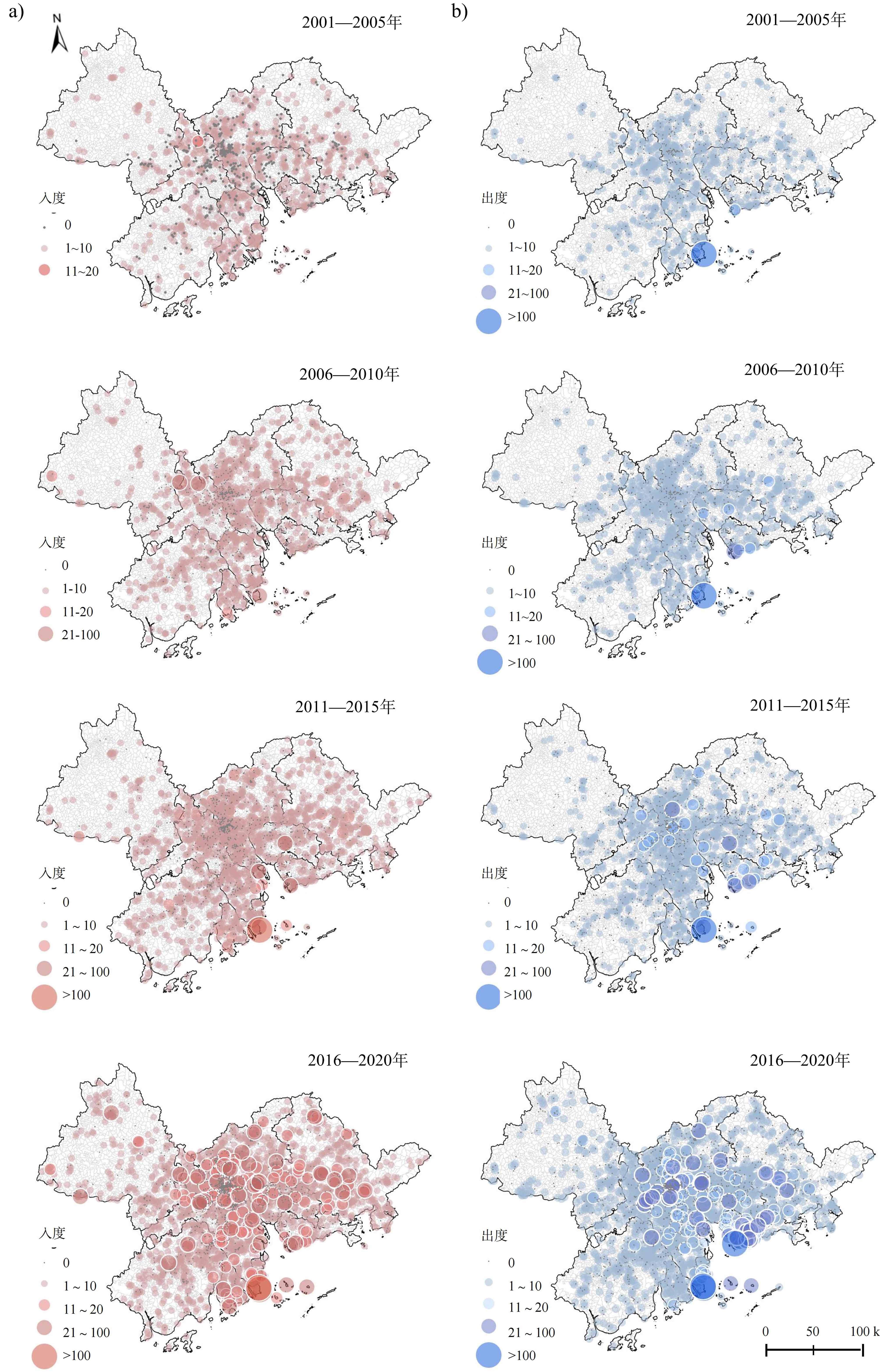 Distribution of investment source nodes(a) and investment node(b) in the Pearl River Delta from 2001 to 2020