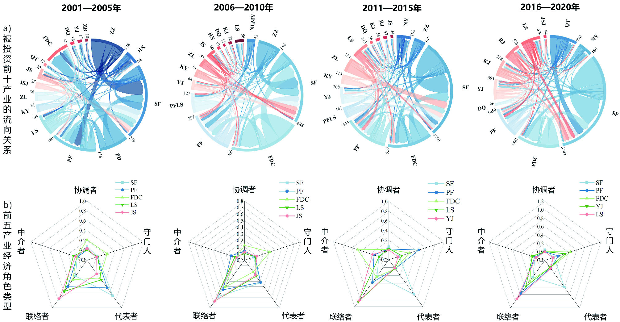 The relationship between industrial investment and the top ten industries in the Pearl River Delta from 2001 to 2020(a) and the economic role types of the top five industries(b)